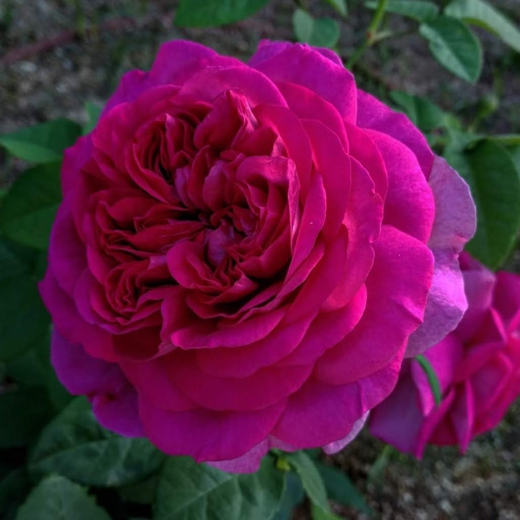 クリムゾンパープルの大輪の花を咲かせる。咲き始めはやや明るめのピンク、ルーズな花形がとても印象的。ダマスクの強い香りがある。