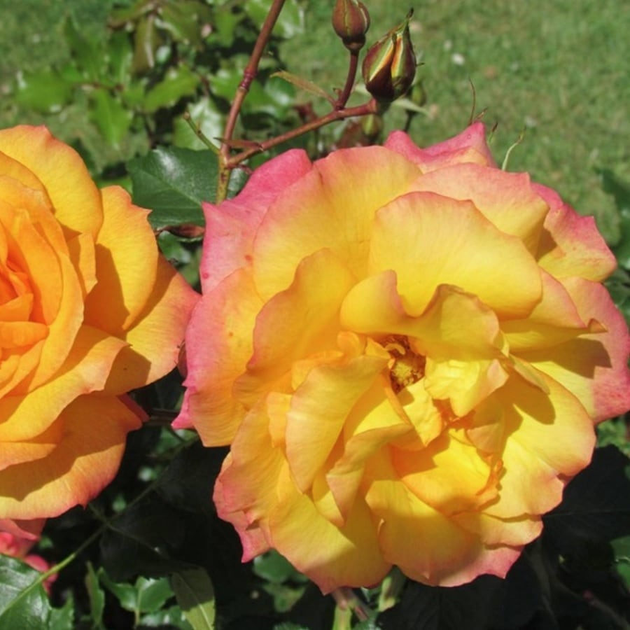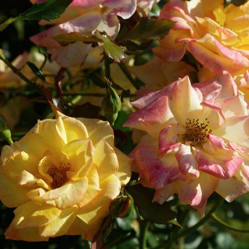 明るいイエローの半八重咲き、咲き進むと花弁の端が赤く染まる。香りはあまりないものの花持ちが良く晩秋まで繰り返し咲き続ける。強健。