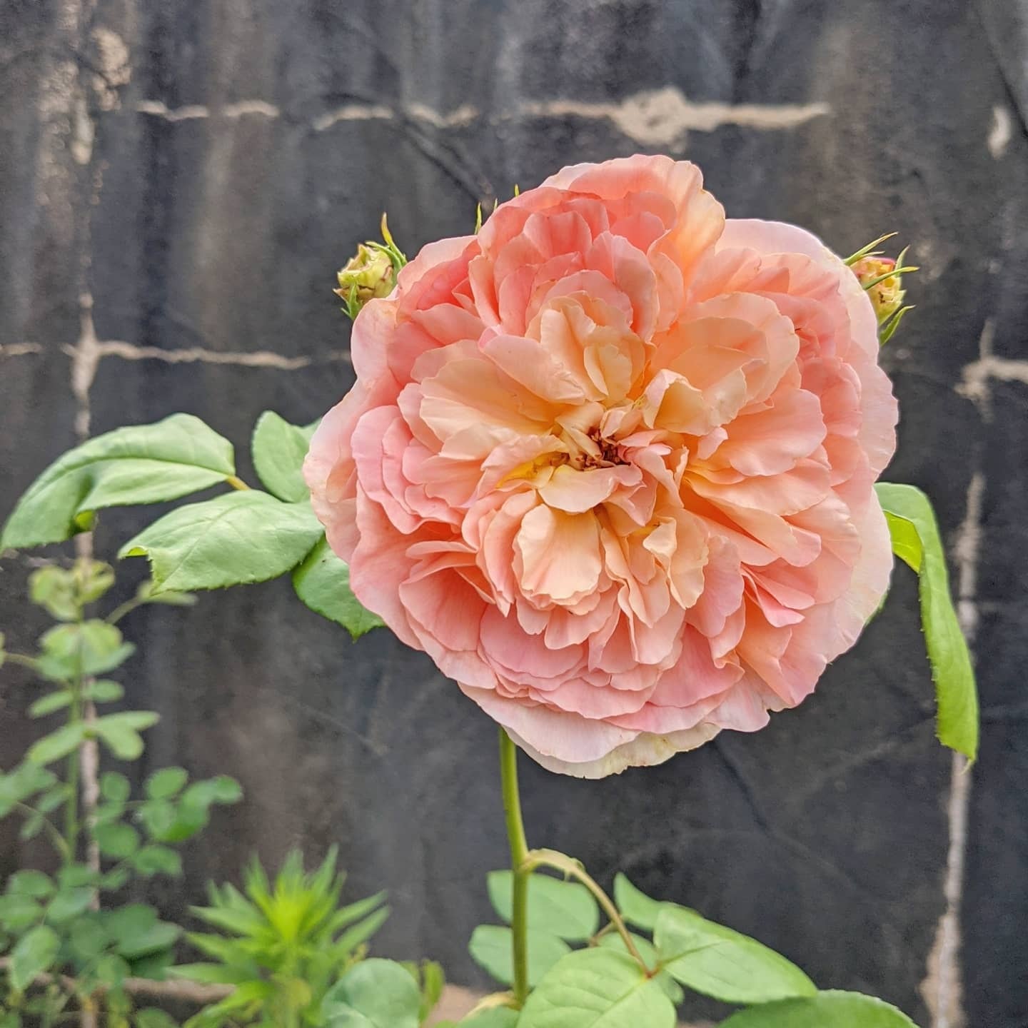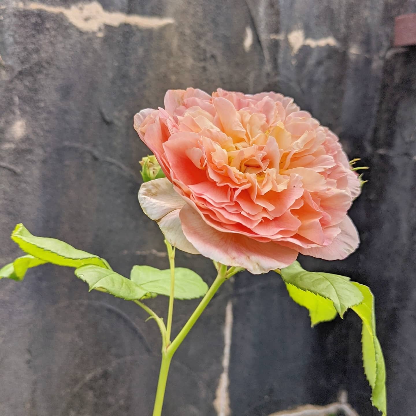フランスの老舗デルバール社の大輪クライミングローズ。オレンジからアプリコットピンクの大柄なで華やかな花を咲かせフレンチローズの代名詞のような品種。樹が成熟すると秋にも割と返り咲く。