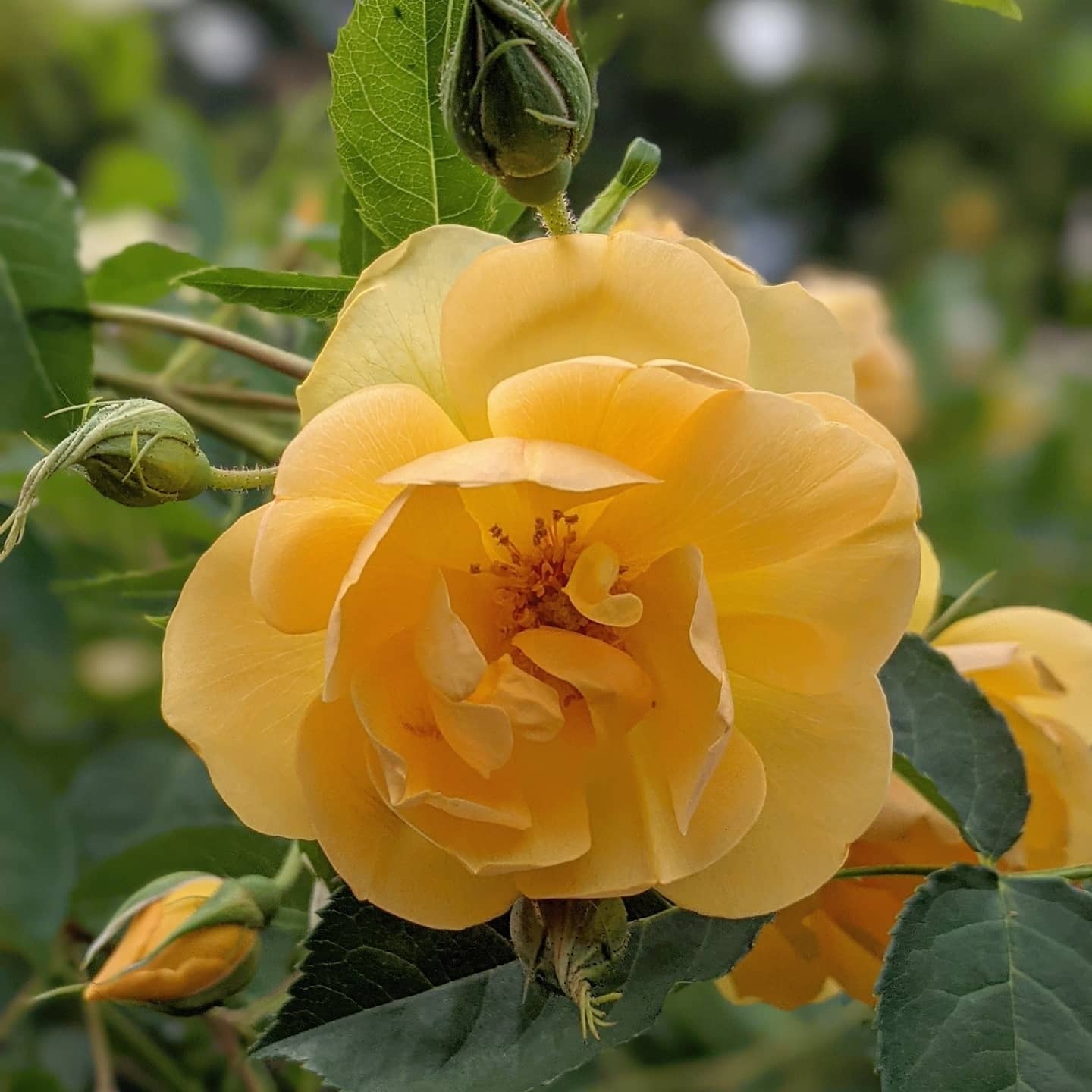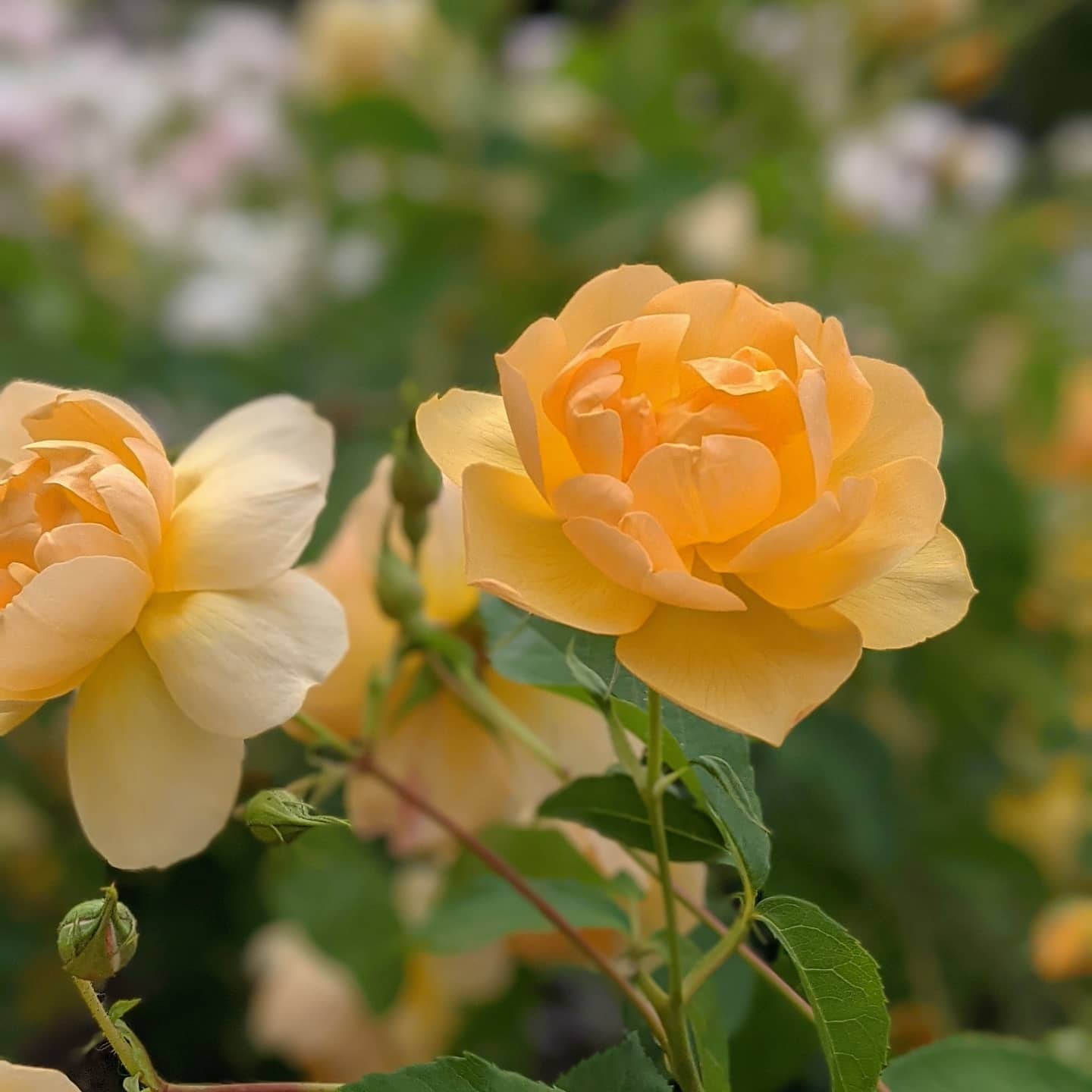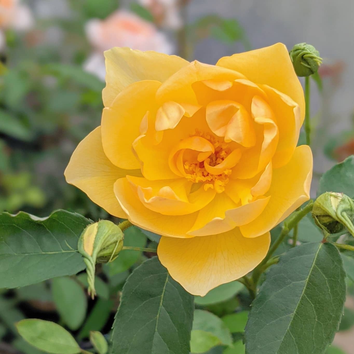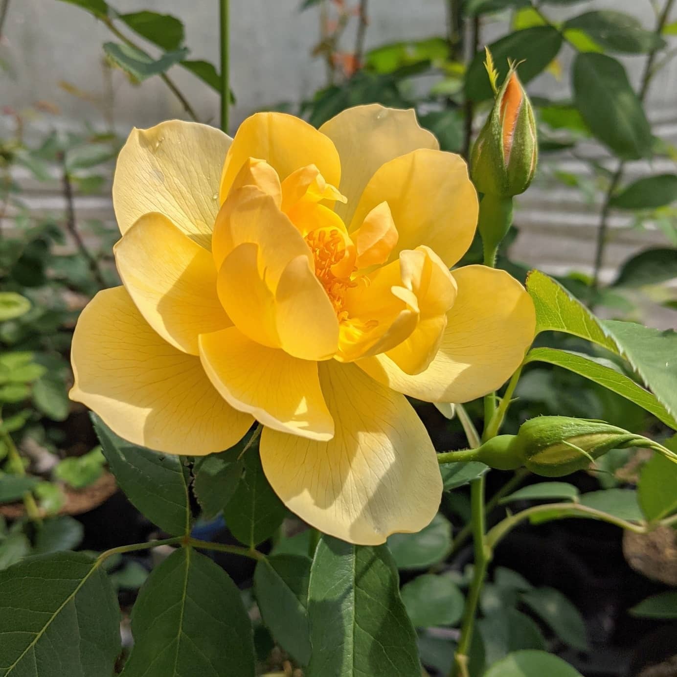 親のグラハム・トーマスをコンパクトにしたような可愛らしい雰囲気の花。親よりも花弁の数は少ないが次々と咲き続け庭を彩ってくれる。強健