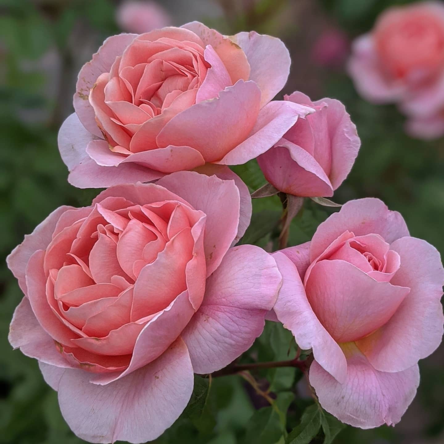 コーラルピンクの優しい色合い、中心には少し琥珀色が交じる。強健でよく伸びるので小さめのつるバラにも良い。