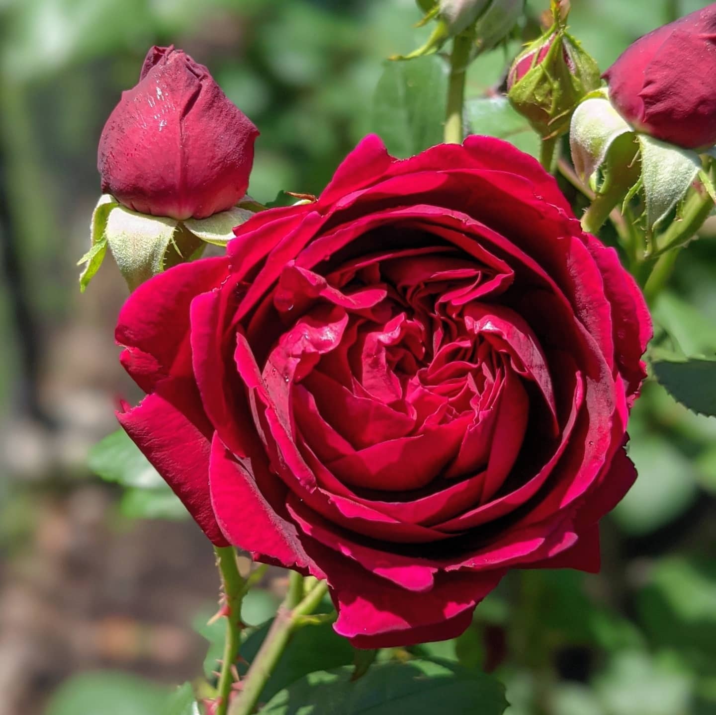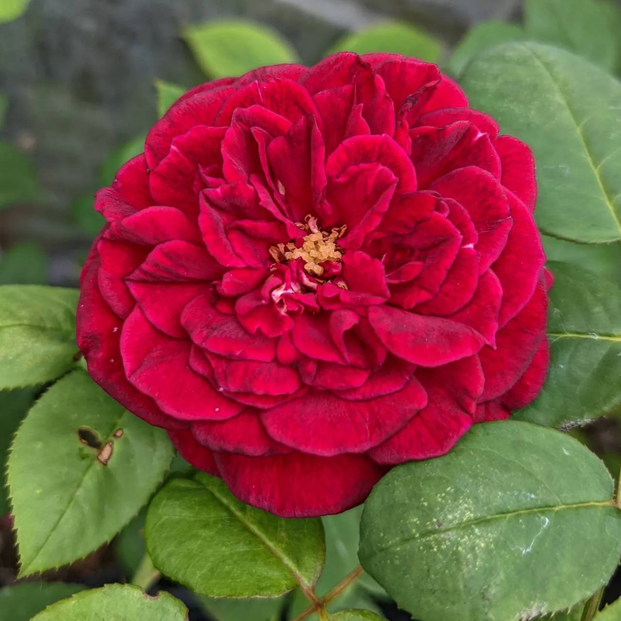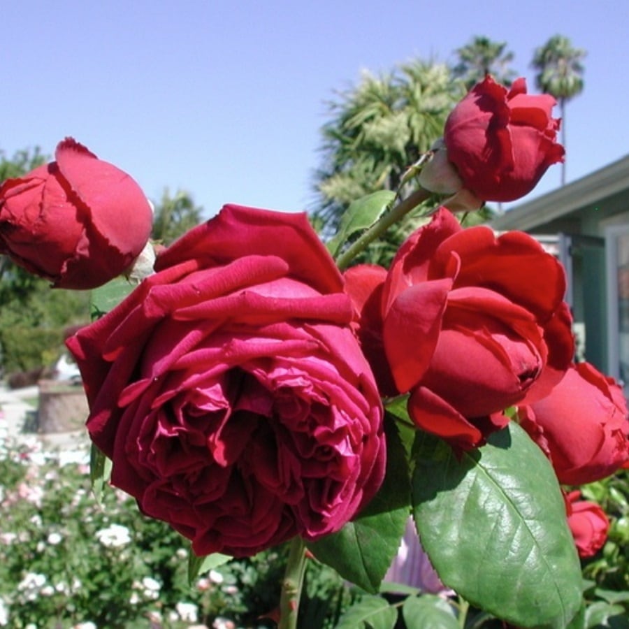 赤いイングリッシュローズ第一号と世界で初めて作られた黒バラをかけ合わせて作られた品種。深みのあるモス自利家のない赤が大変に美しい。葉が落葉しやすい欠点はあるものの樹勢は非常に強く強健で育てやすい。