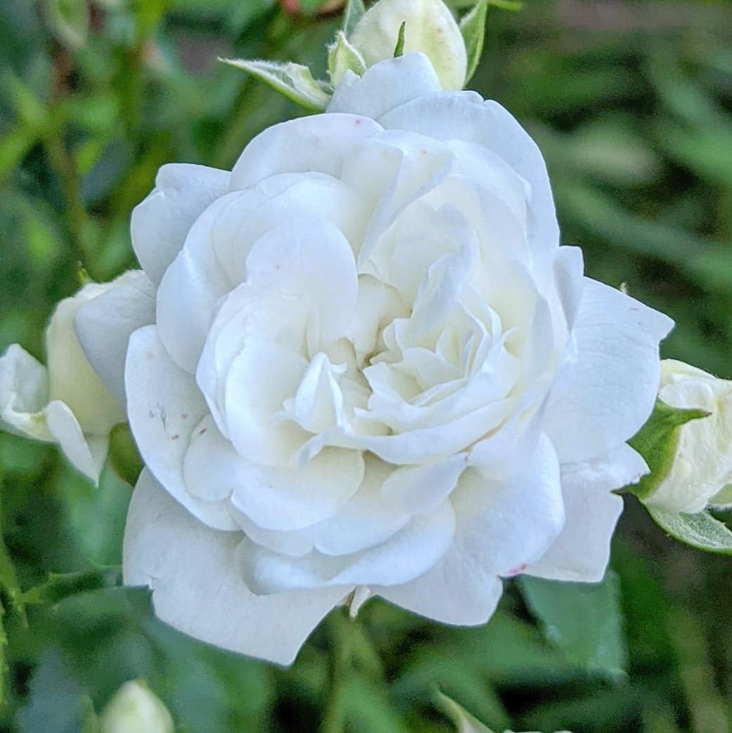 混じりけのない白い小さなカップ咲き、ミニチュアに分類されてはいるが非常にたくましく伸びるのでグラウンドカバー向き。とても強健。