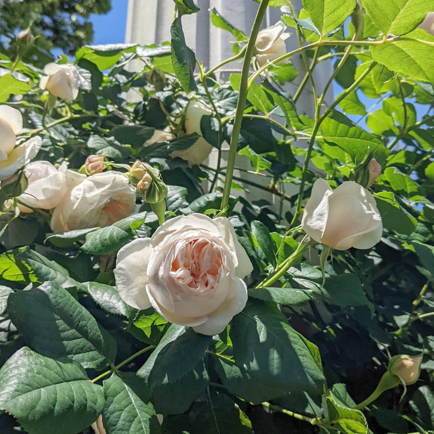 ヘリテージの枝変わりで赤みの帯ない花がこれまた美しい。あまり知名度もなくいつの間にかフェードアウトした品種だが歴史に残したい名花。