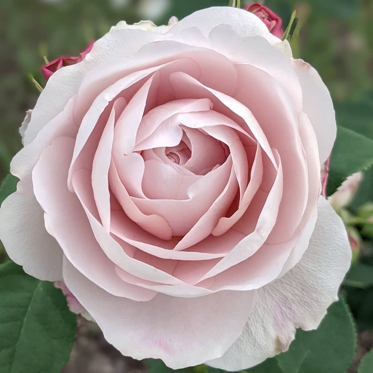 ライラックローズの枝変わりで薄いグレーピンク、稀に花弁の縁が濃いライラックピンクに染まる。当園のオリジナル品種。※生産数が確保できない場合販売中止の可能性があります。