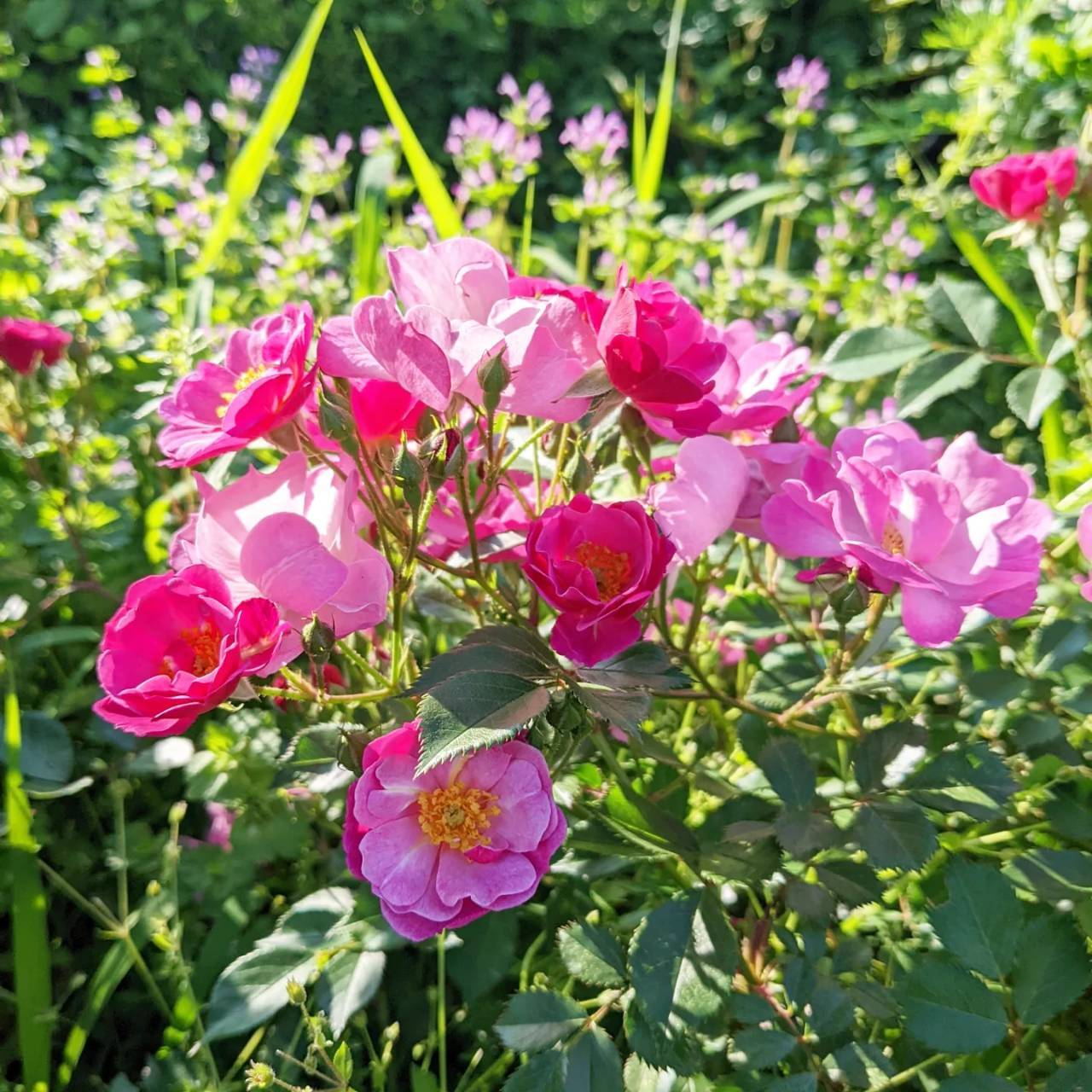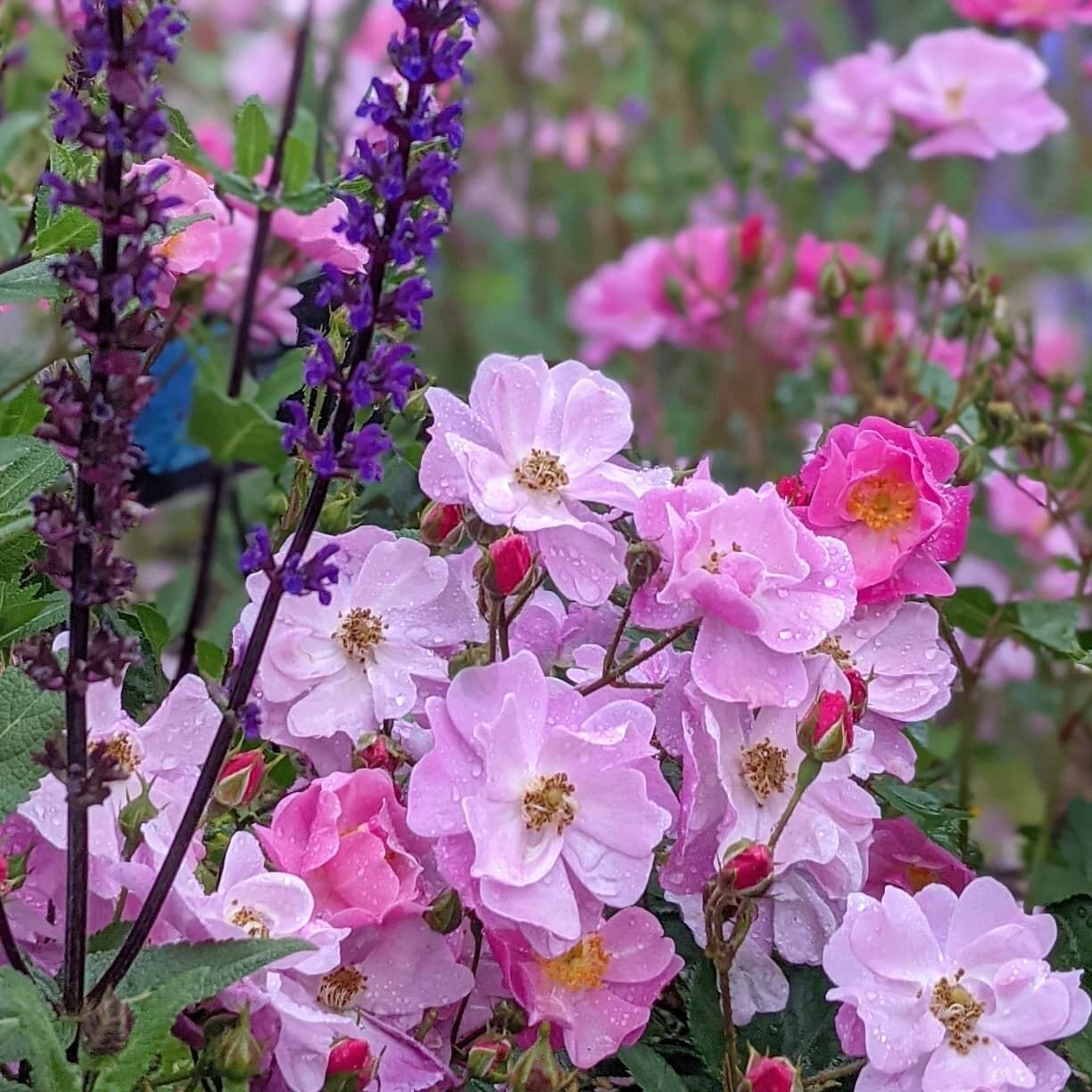 白花のハイブリッド ムスクとポリアンサローズの掛け合わせで作られた品種。モーヴピンク、ほのかにラベンダーを含む色合いが優しい雰囲気。強健でよく伸び絶え間なく花をつける。