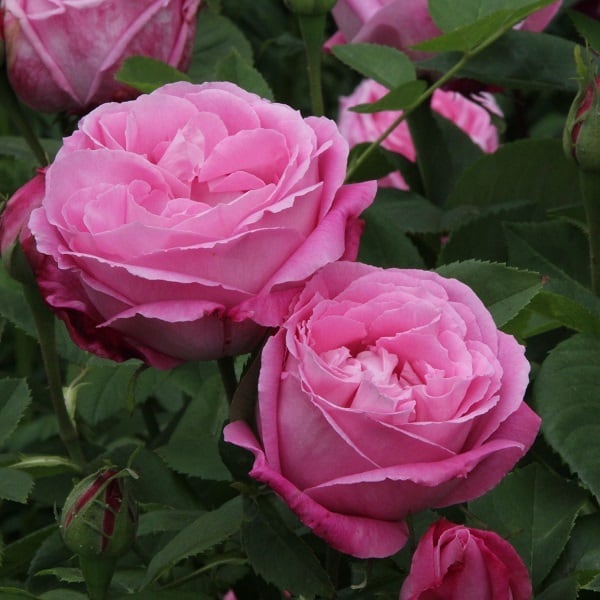 輝くようなシルバーピンク。香りがとても強く、花もちも良い。花びらが反り返る「剣弁咲き」で咲くこともある。切り込んで小さくも出来ますが伸ばすと2mくらいのつるバラにも出来る。よく咲き、よく茂るので肥料はしっかりと。