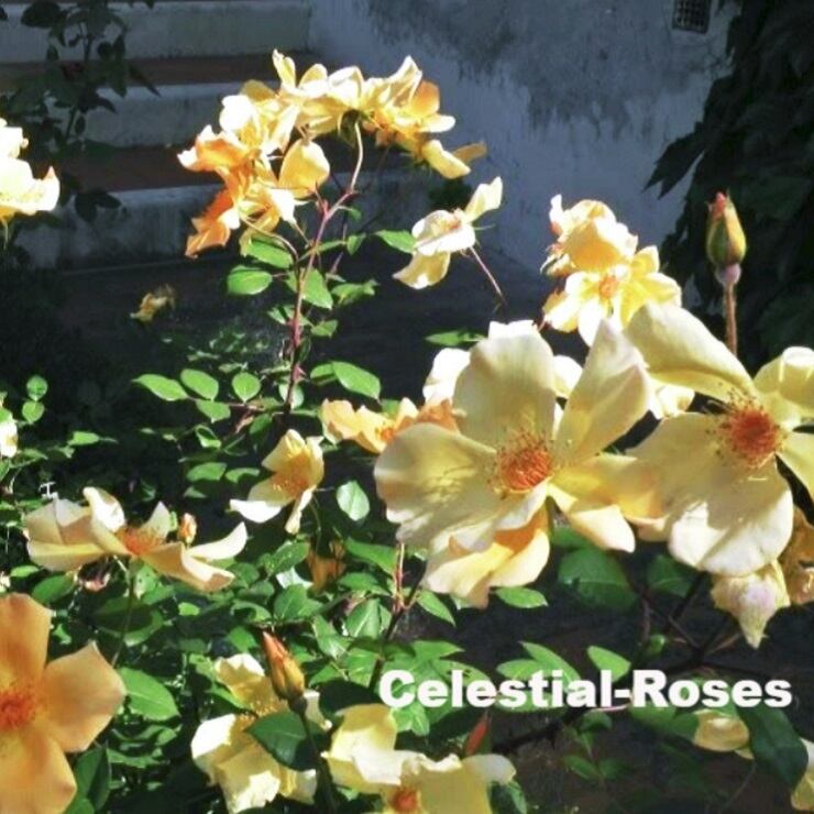 四季咲きで軽いティーの香り。一重のハイブリッド ティーはピンク系が多い中、卵に黄身のような暖かなイエロー。深緑色の葉もチャームポイント。
