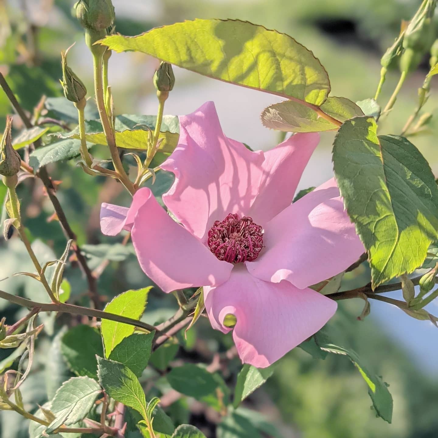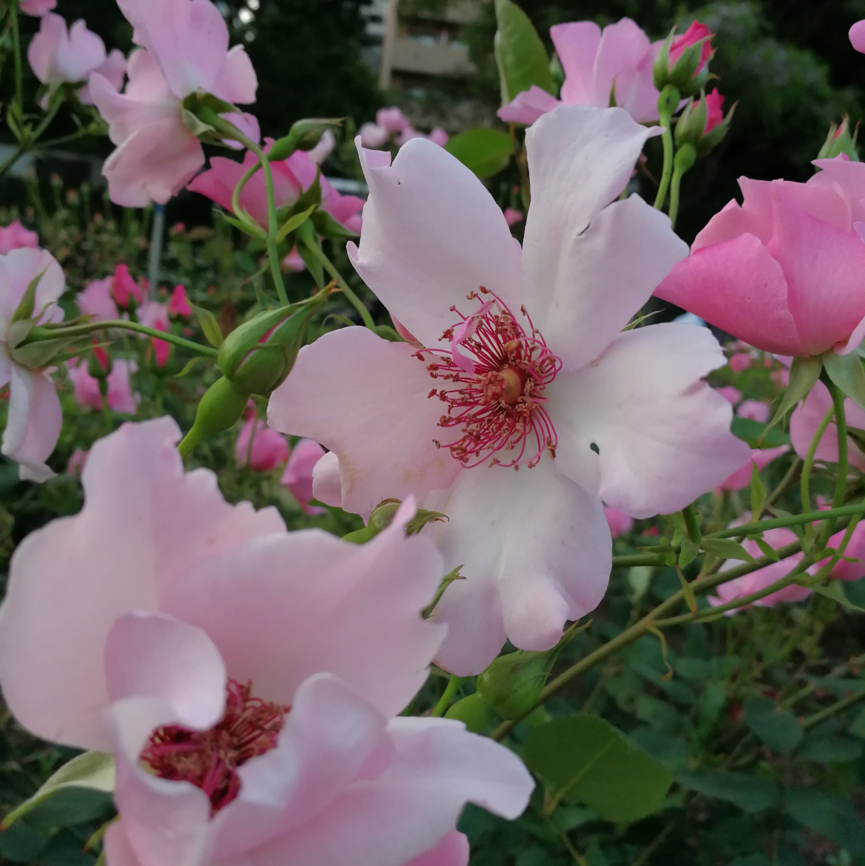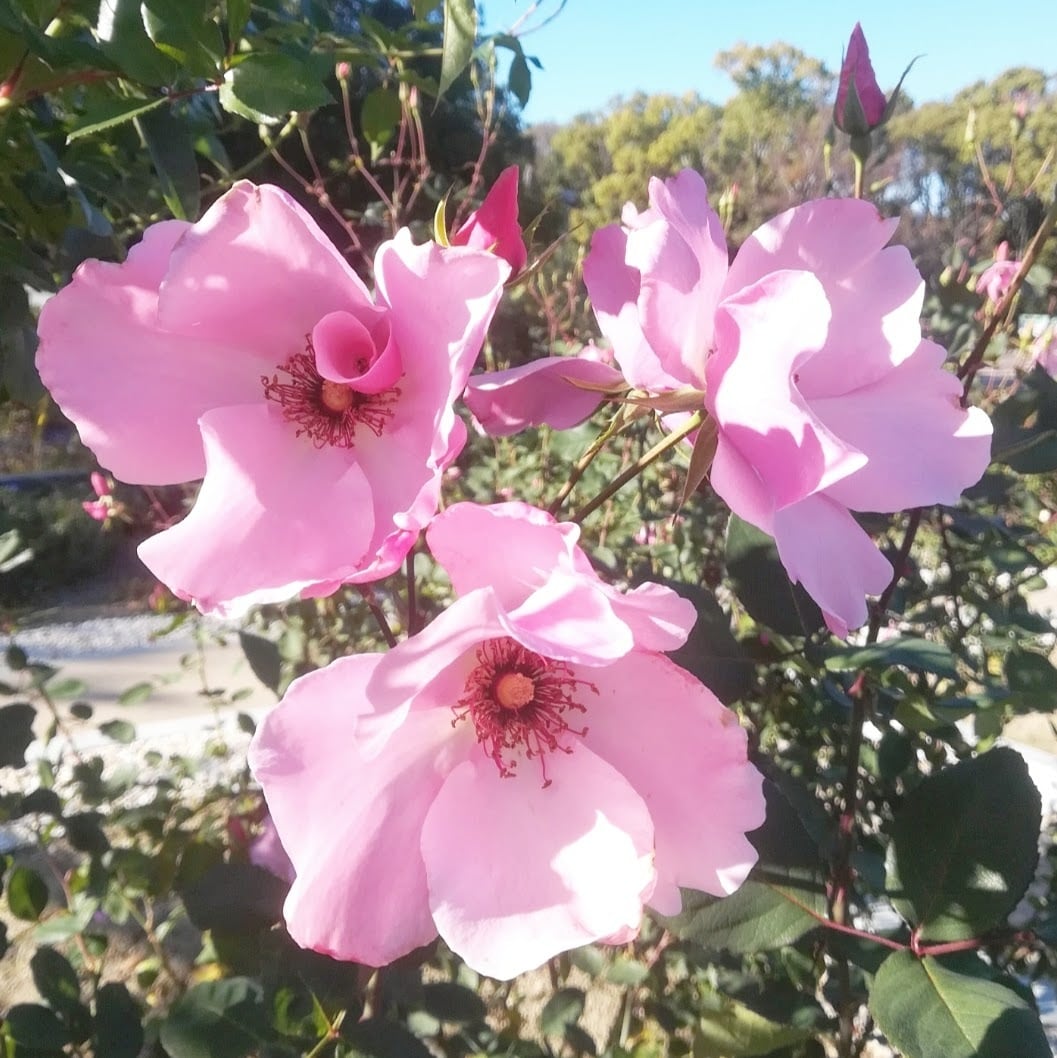 グレイがかったピンクの一重咲き。房咲きで花を付け、蝶が舞っているかのような趣。「優雅なベス」の名前の通り、一重咲きのバラは多いがこの優雅さにまさるバラはなかなかない。赤い雄しべが可愛らしい。