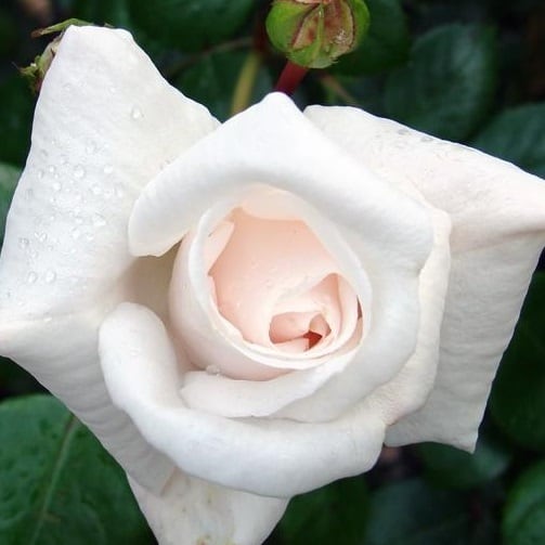 八重咲き白の浅いカップ咲き、ごく薄いピンクが乗ることもある。 「ニュードーン」の枝変わり品種。親のニュードーンよりもより清楚で慎ましやかな雰囲気で人気がある。