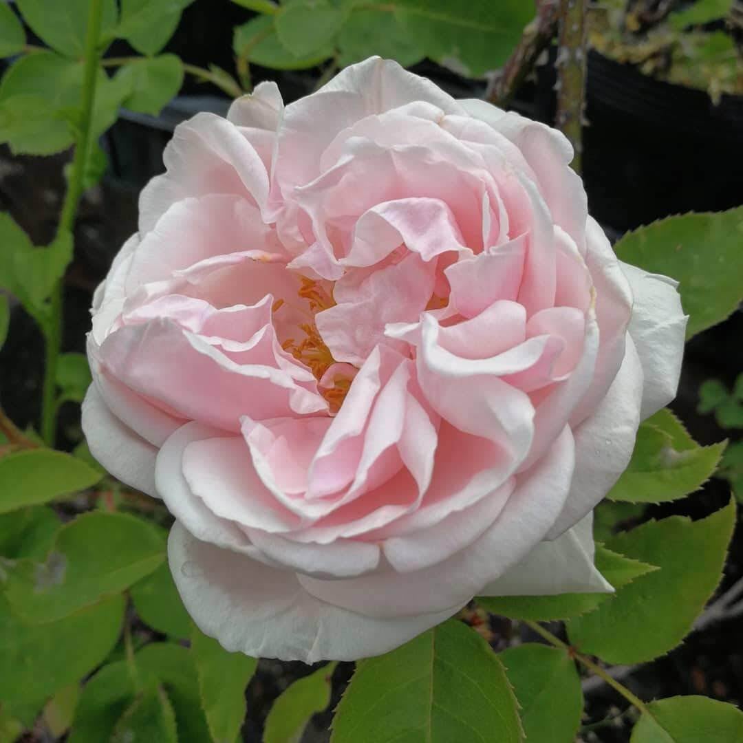 薄いシルバーピンク、花びらの数が多く重ねの厚いカップ咲きになる。繰り返しよく咲く。少し短めに選定してやると良い花が咲く。
