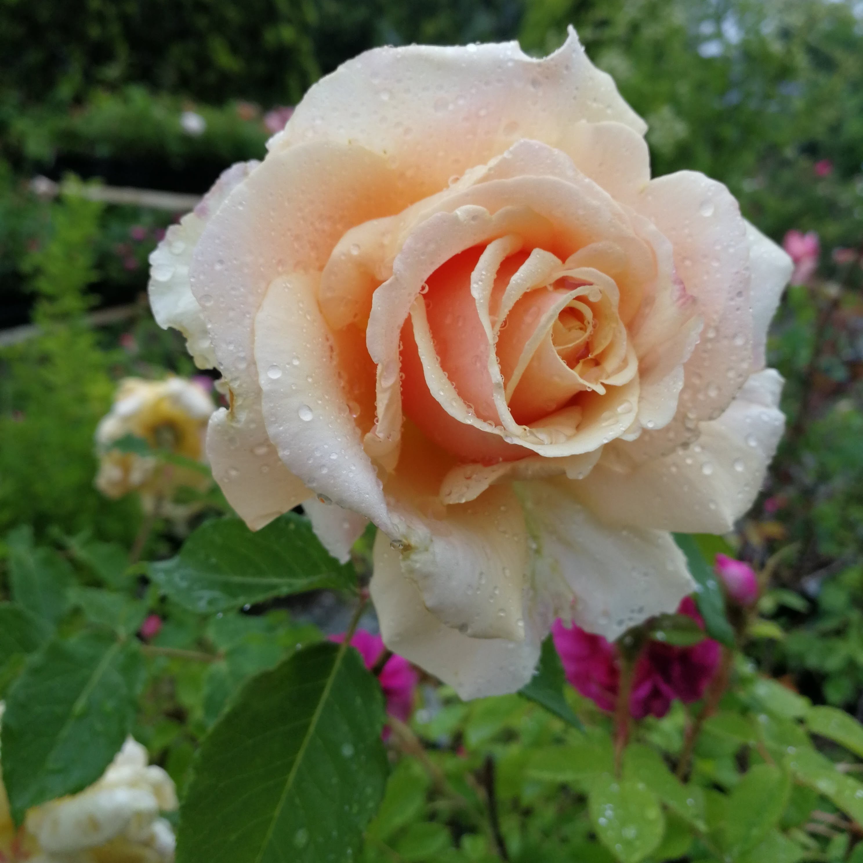 バフアプリコット、オレンジ、イエローの混じり合う複雑な色合い。たおやかな雰囲気の花。比較的耐寒性が強めなので寒冷地向けハイブリッドティー種としておすすめ。良香