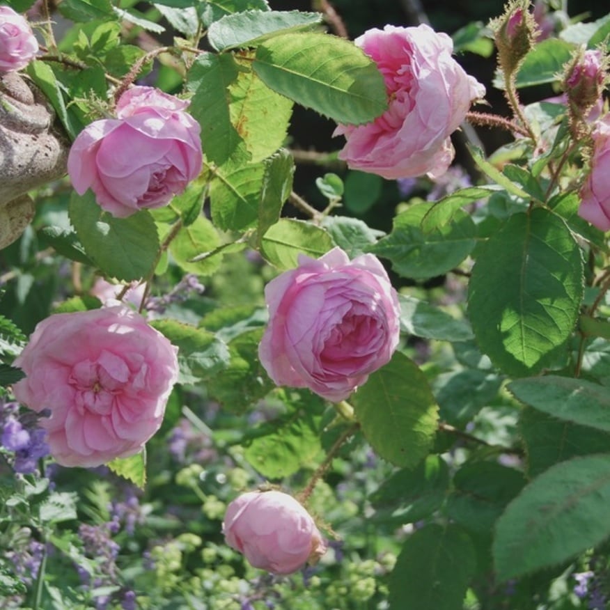 ショッキングピンクの重ねが厚い花容。蕾や枝に「苔」状の腺毛が生える。強香、強健