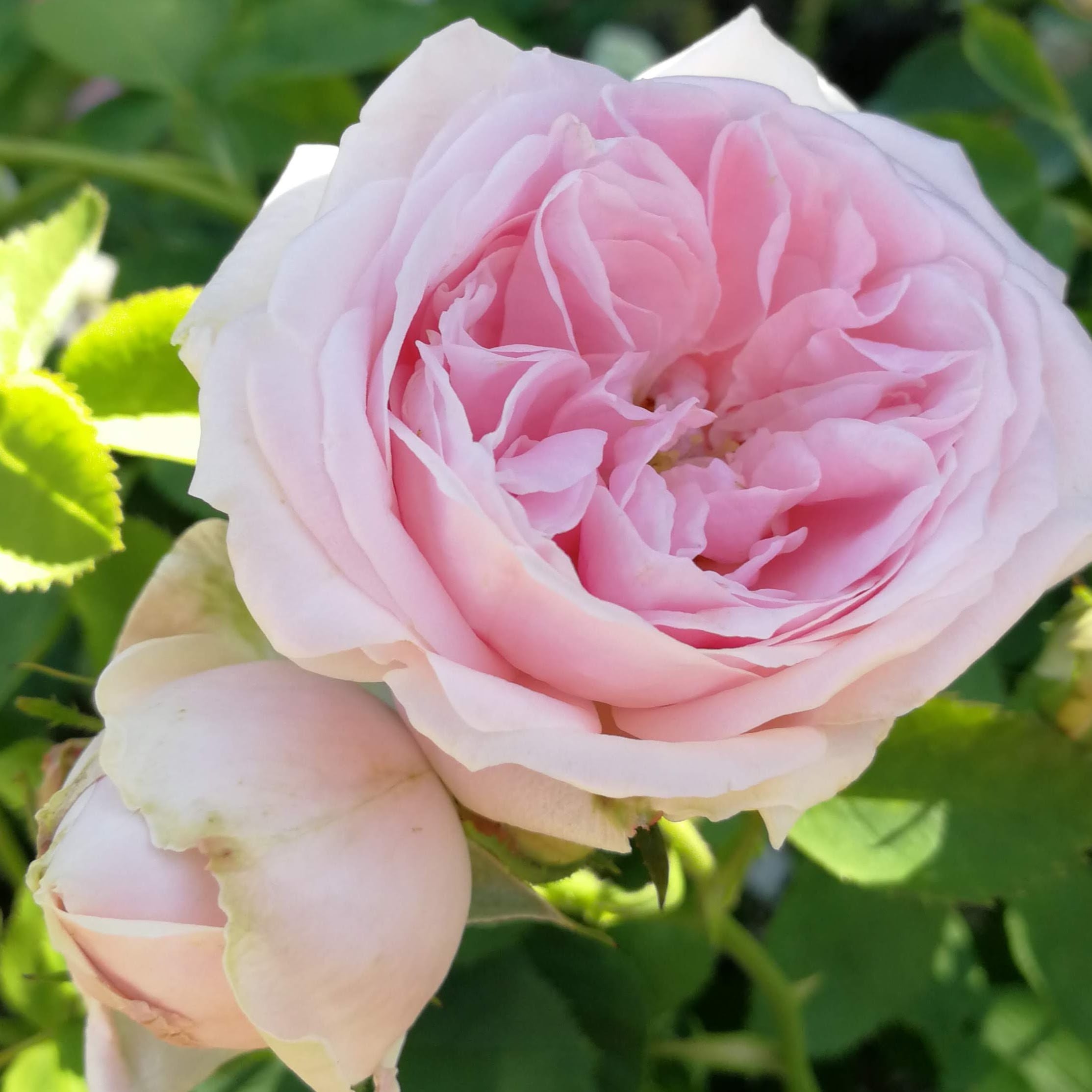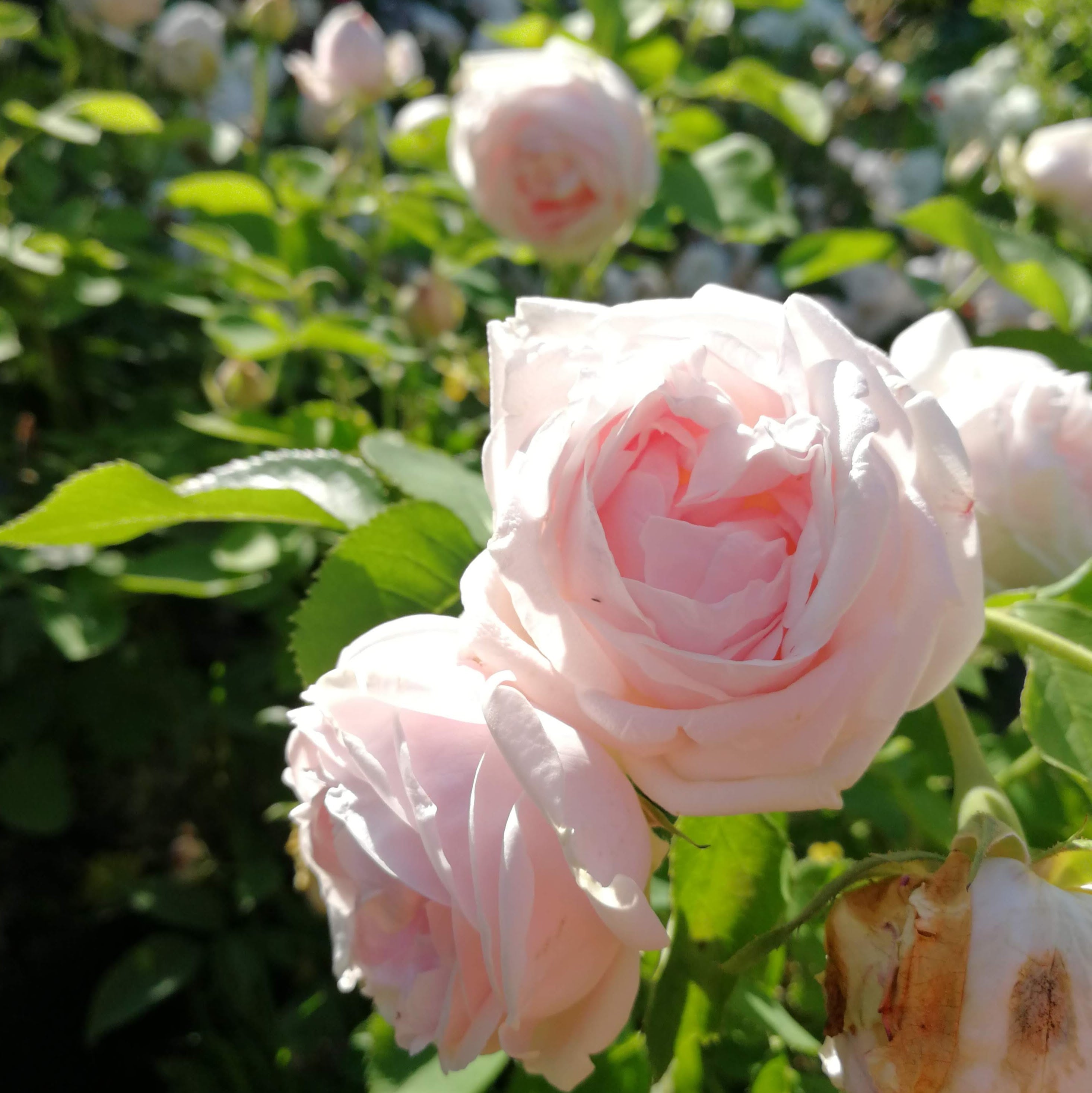 うすピンクから時にアプリコットが混ざる。重ねの多い八重カップ咲き。 良香。秋にも返り咲く。