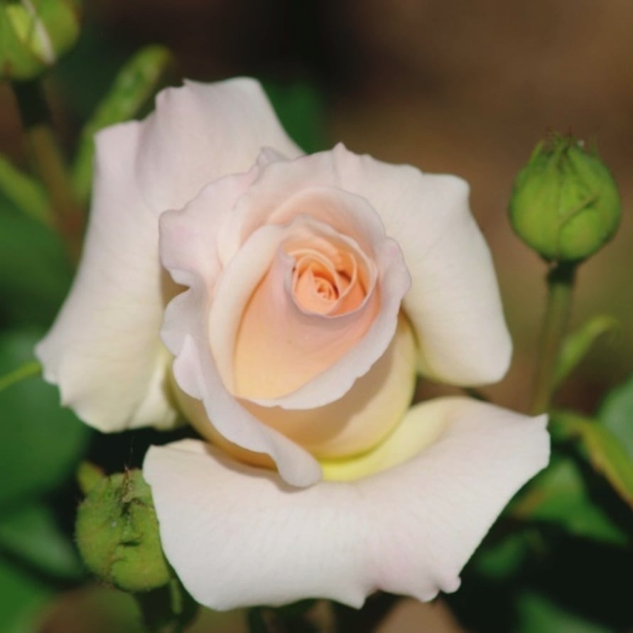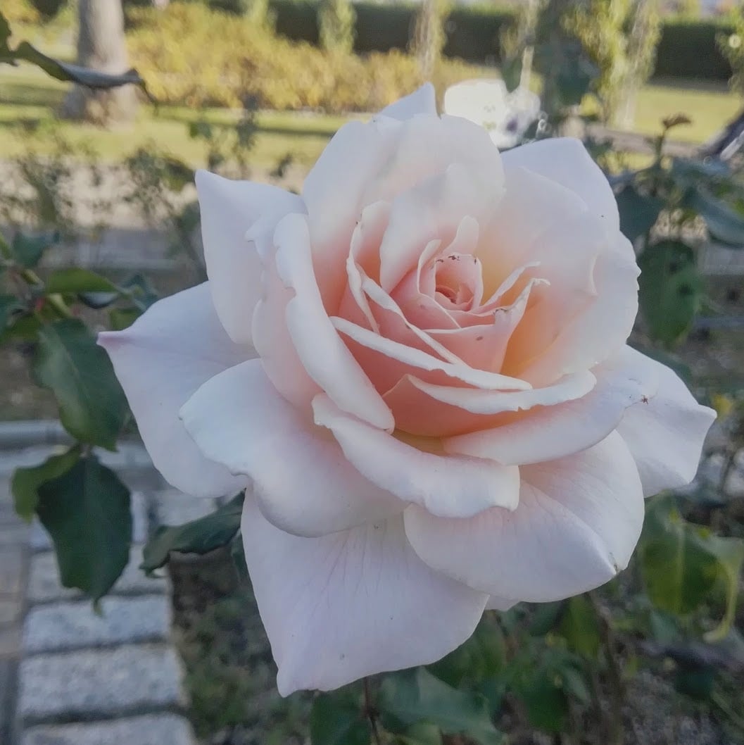 ピンクがかったアイボリーホワイト。丸弁の大輪咲きでとても優雅な花。フロリバンダにしては大きな花が咲く。香りはあまり無いが花持ちがよく樹も強健に育つ。