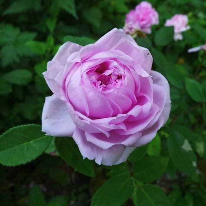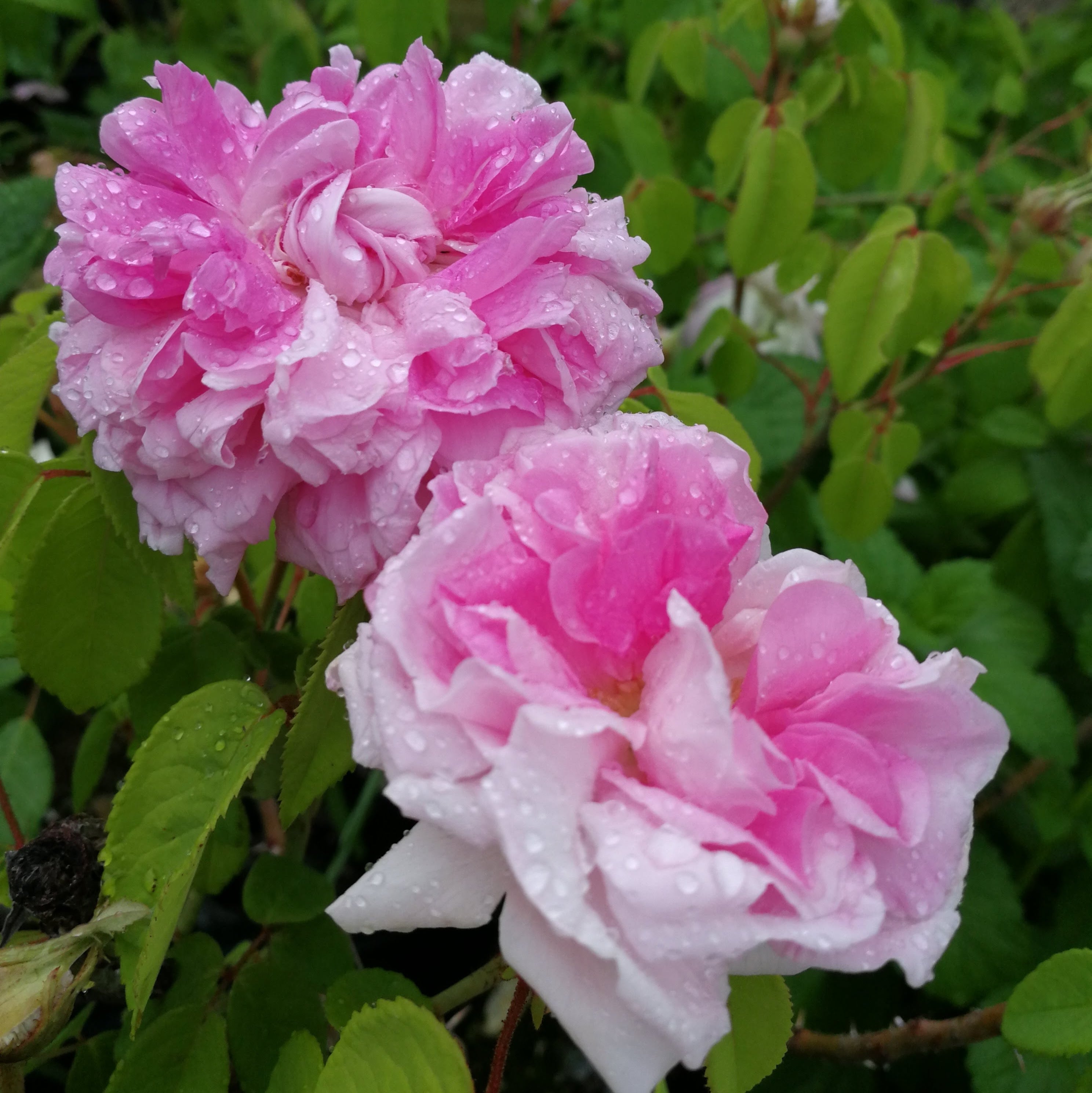 濃いピンク、端のほうが薄くなる。花びらがぎっしり詰まったロゼット咲き。伸ばせばつるバラとしても使える。強健