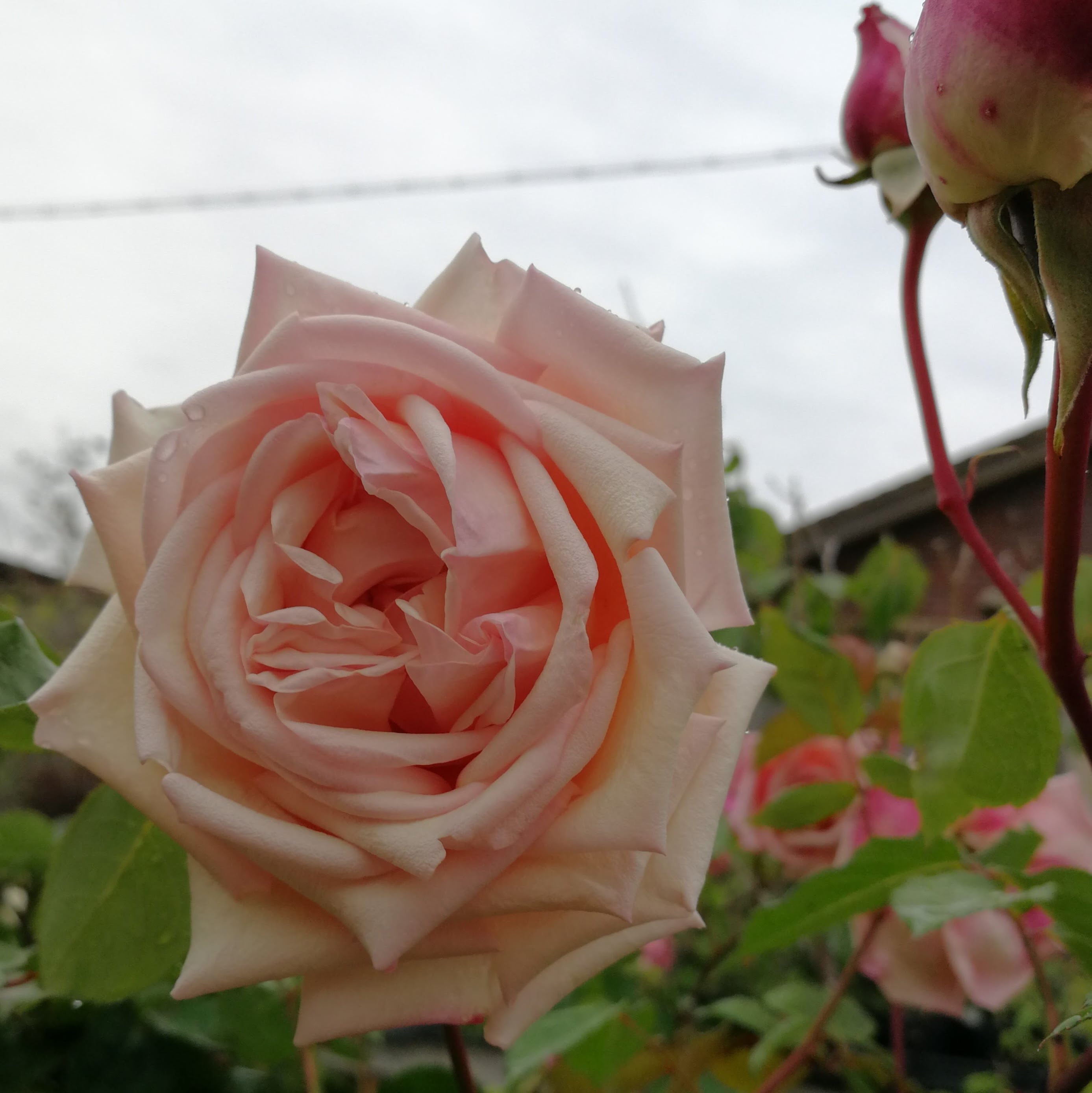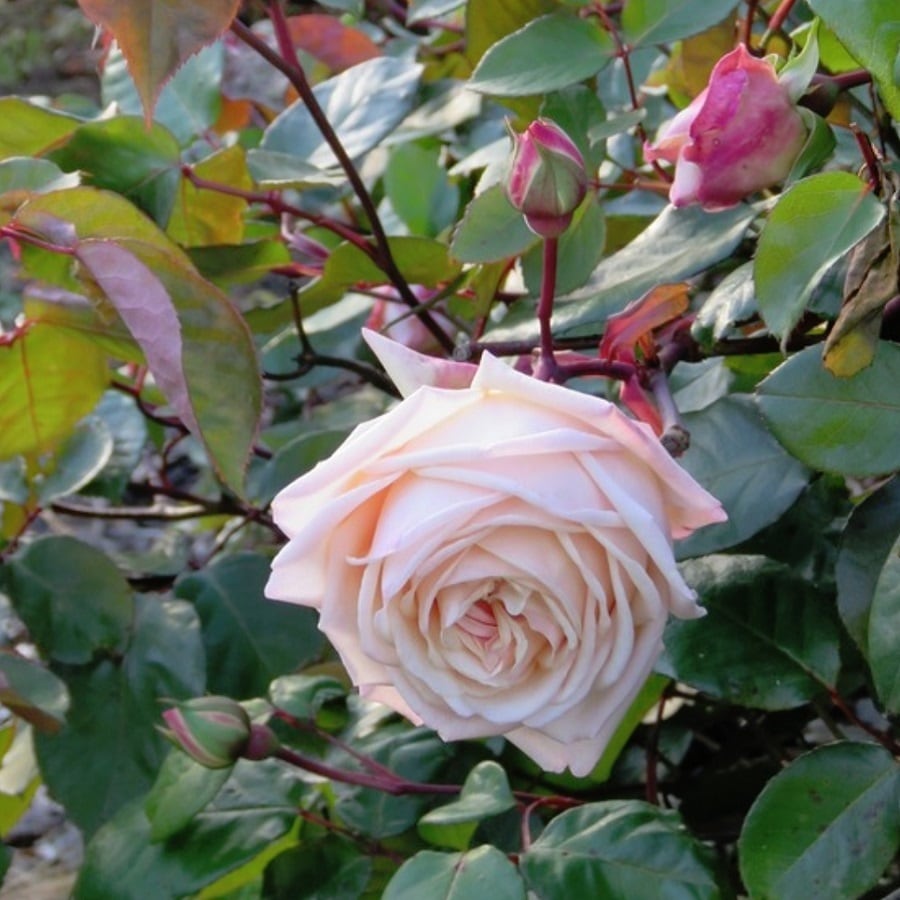 中輪、重ねの厚いゆるやかなロゼット咲き。淡ピンク〜クリームに咲きうつろう。銘花グロワールドゥデイジョンの子孫。ほのかなティーの香り。