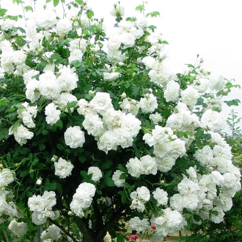 純白の重ねが厚く浅いカップ咲き。アルバローズに分類されることもある。棘はとても小さい。大きく伸びる枝に溢れんばかりの花をつける。強香