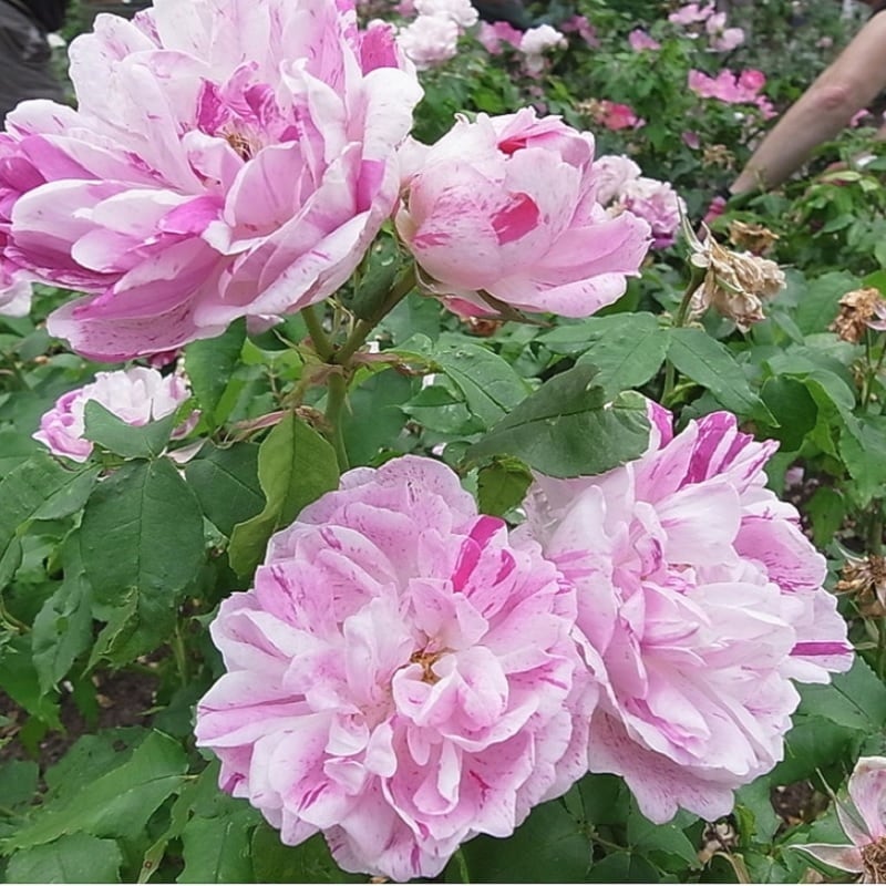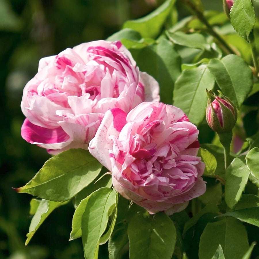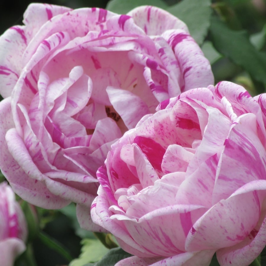 薄ピンクに濃いピンクの絞りや斑がランダムに入る。カップ咲き。春に二度、時々秋にも返り咲く。ブルボンローズの強い香り。