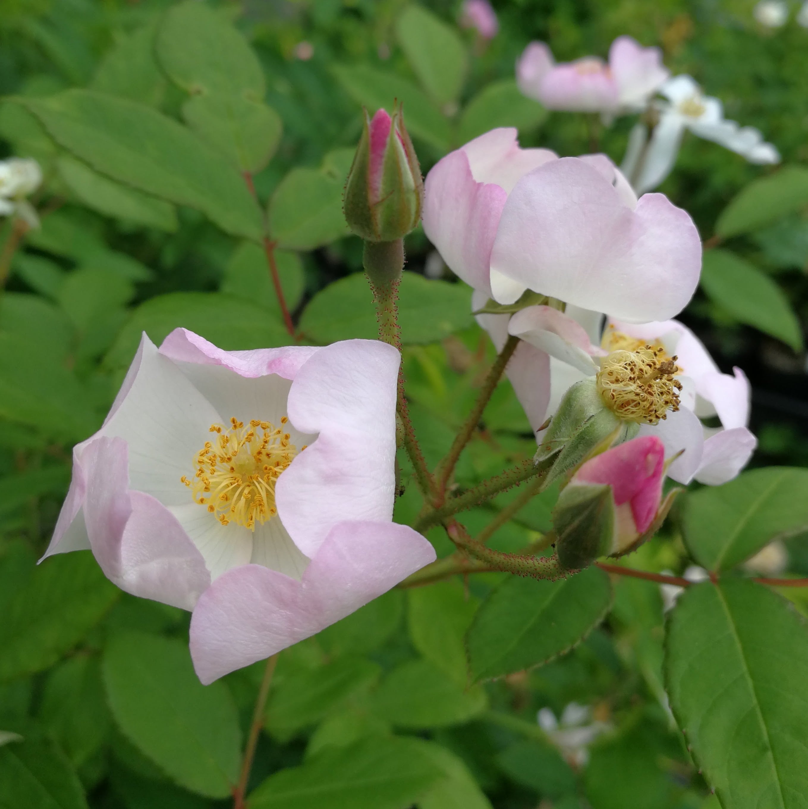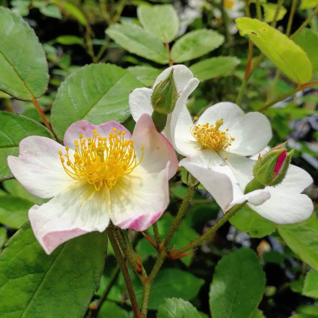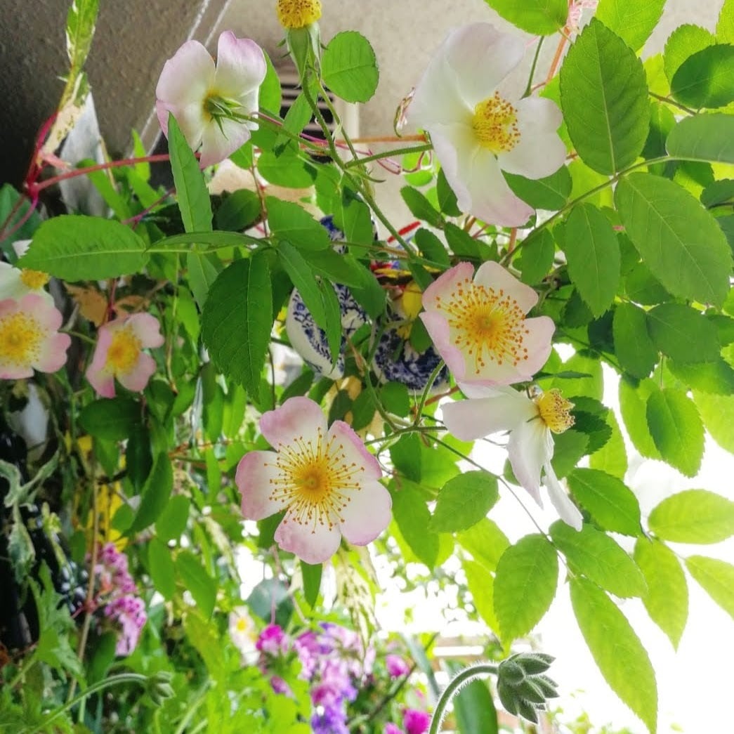 一重の大房咲き。一重のつるバラにしては大きめの花。桜のような風情がある。白〜ピンク やせ地や北面、半陰可。実が楽しめる。強健