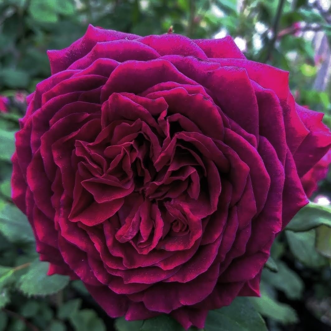 赤黒い紫色。弁数数が多く、外側の花弁の数枚が反り返りとがる。ダマスクの強い香り。強健で大柄に育つ。