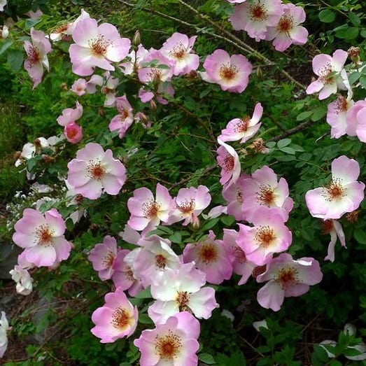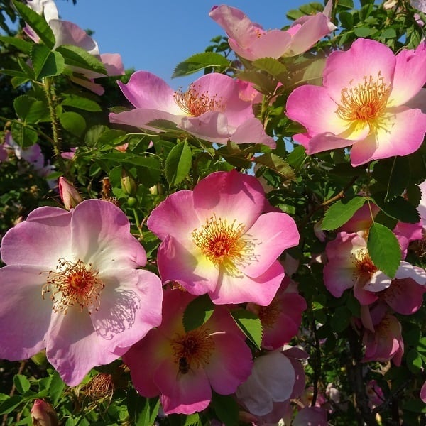 一重の大輪花。中心部がイエロー、花びらの端がピンクに染まりまさに春の明け方のような爽やかさ。強健で大柄に育ち枝は硬い。半日陰にも適応性あり。