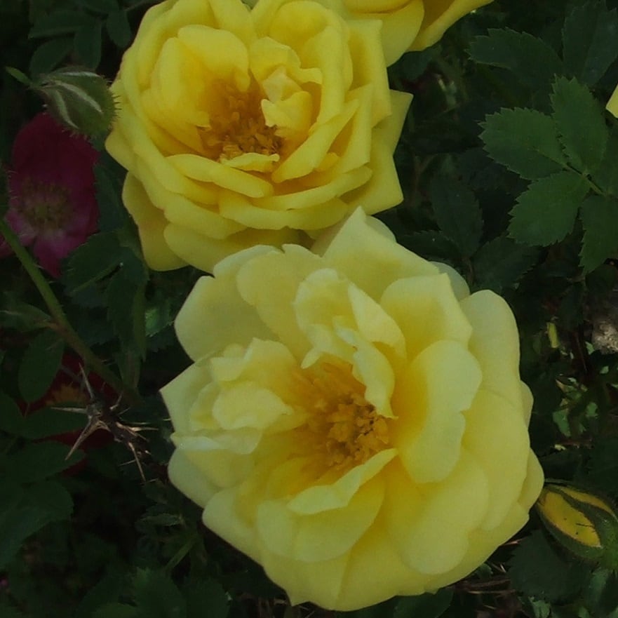 柔らかい黄色の八重咲き。株一面を覆うように咲き乱れる。スコッチローズと純黄色のバラをかけ合わせて作られた品種。