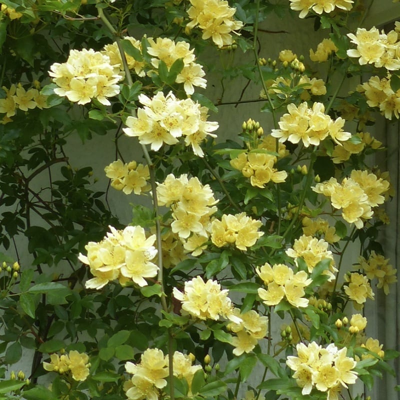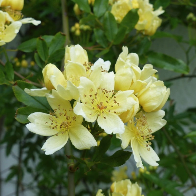 一重咲きの黄モッコウバラ。房咲、八重のものより強い香りがあり、すこし大きめの花弁、幹には少し棘がある。強健
