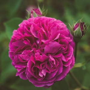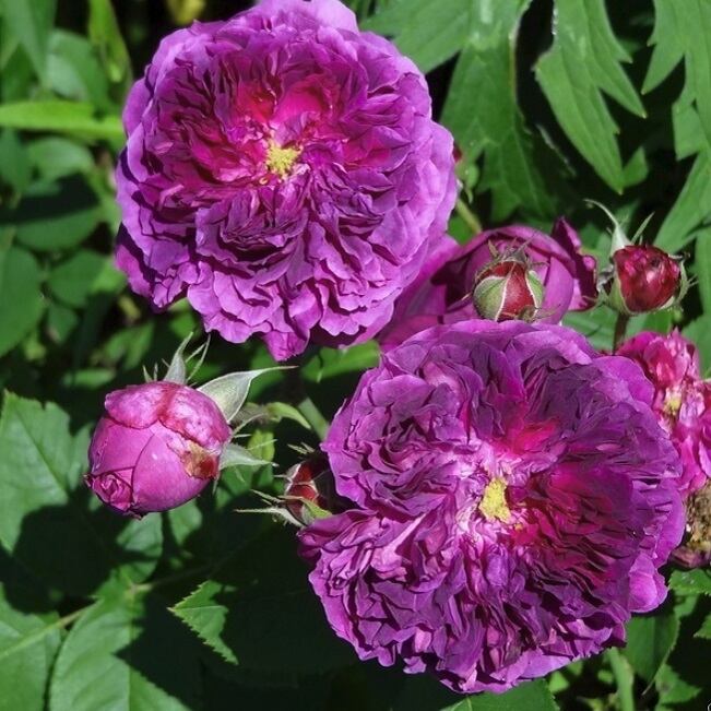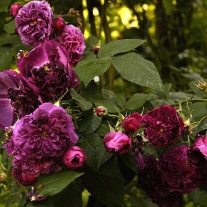赤紫から深い紫への褪色が素晴らしい。重ねの厚い浅めのカップ咲き、強健で丈夫に育つ。名前は「ブロの想い出」という意味。強健。