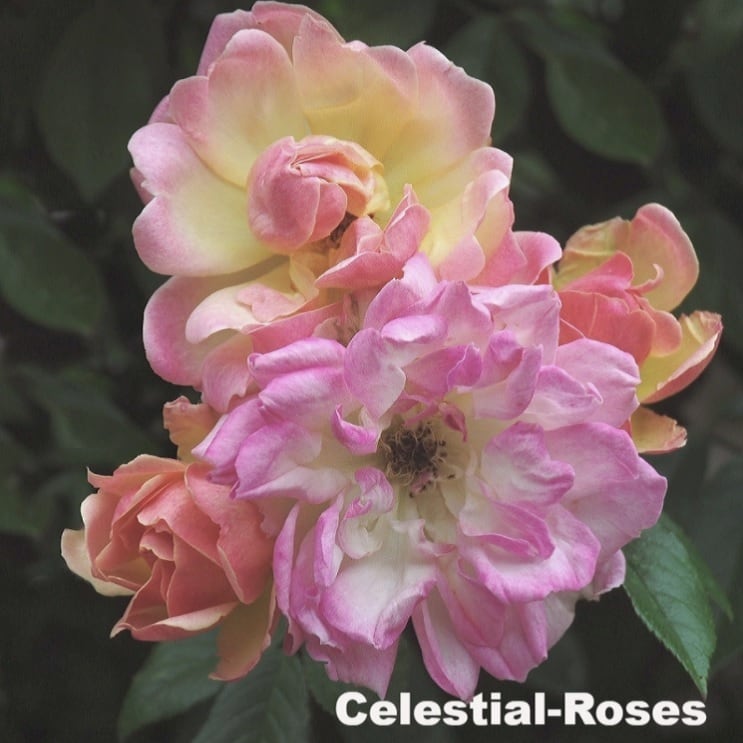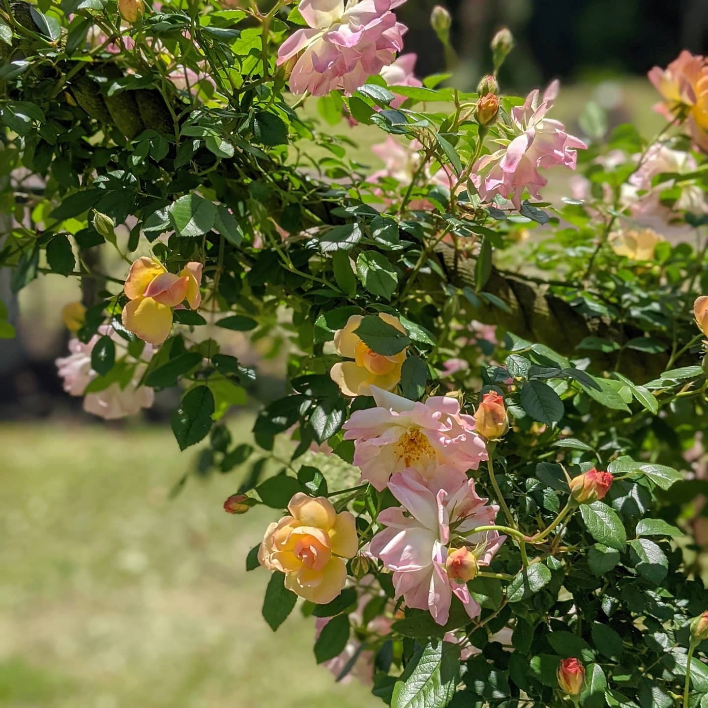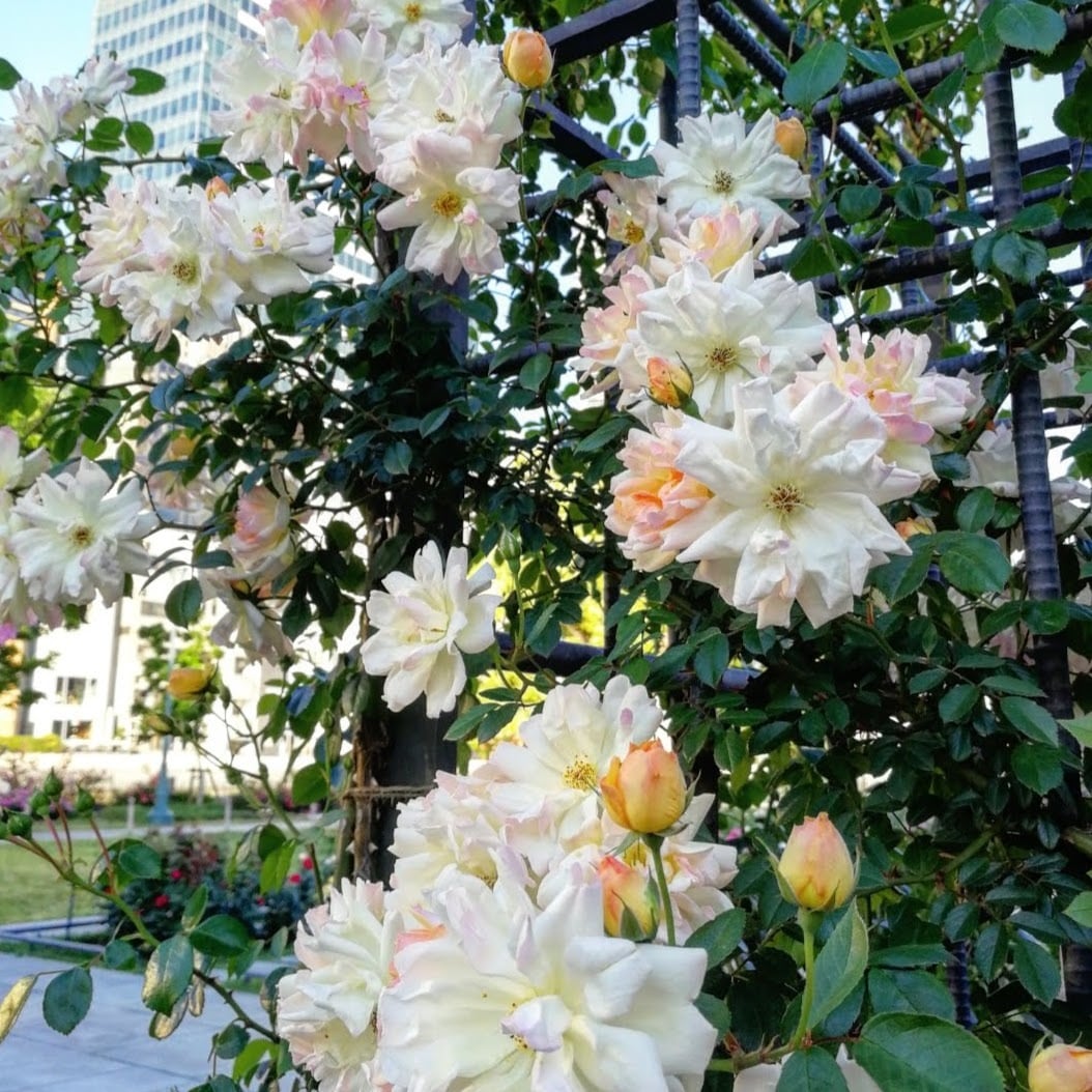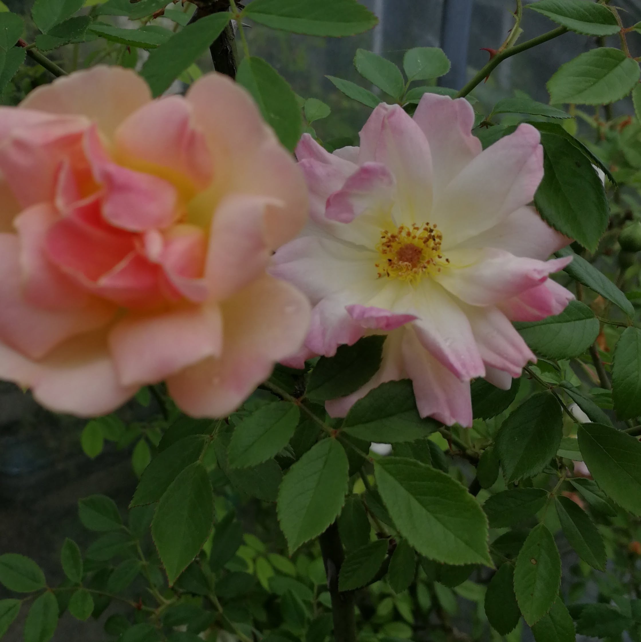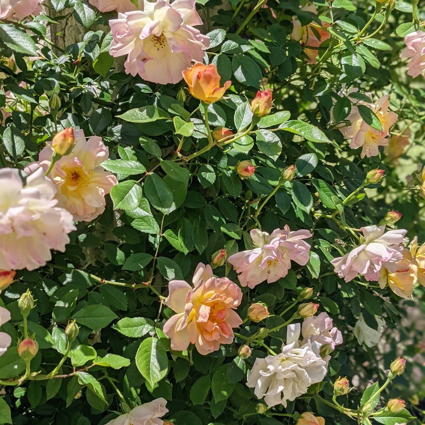 アプリコットイエロー〜ピンク花びらの端が次第に色づく。強健、ほのかなティーの香り。伸びる割には繰り返しポツポツと花をつける。