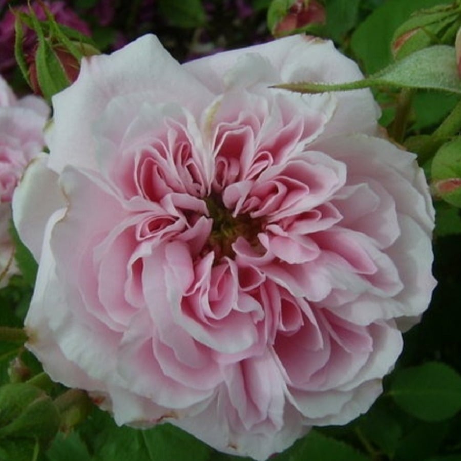 ペールピンクの花びら、中心にボタンアイが覗く美麗花。返り咲き性にも優れ秋まで繰り返し花をつける。