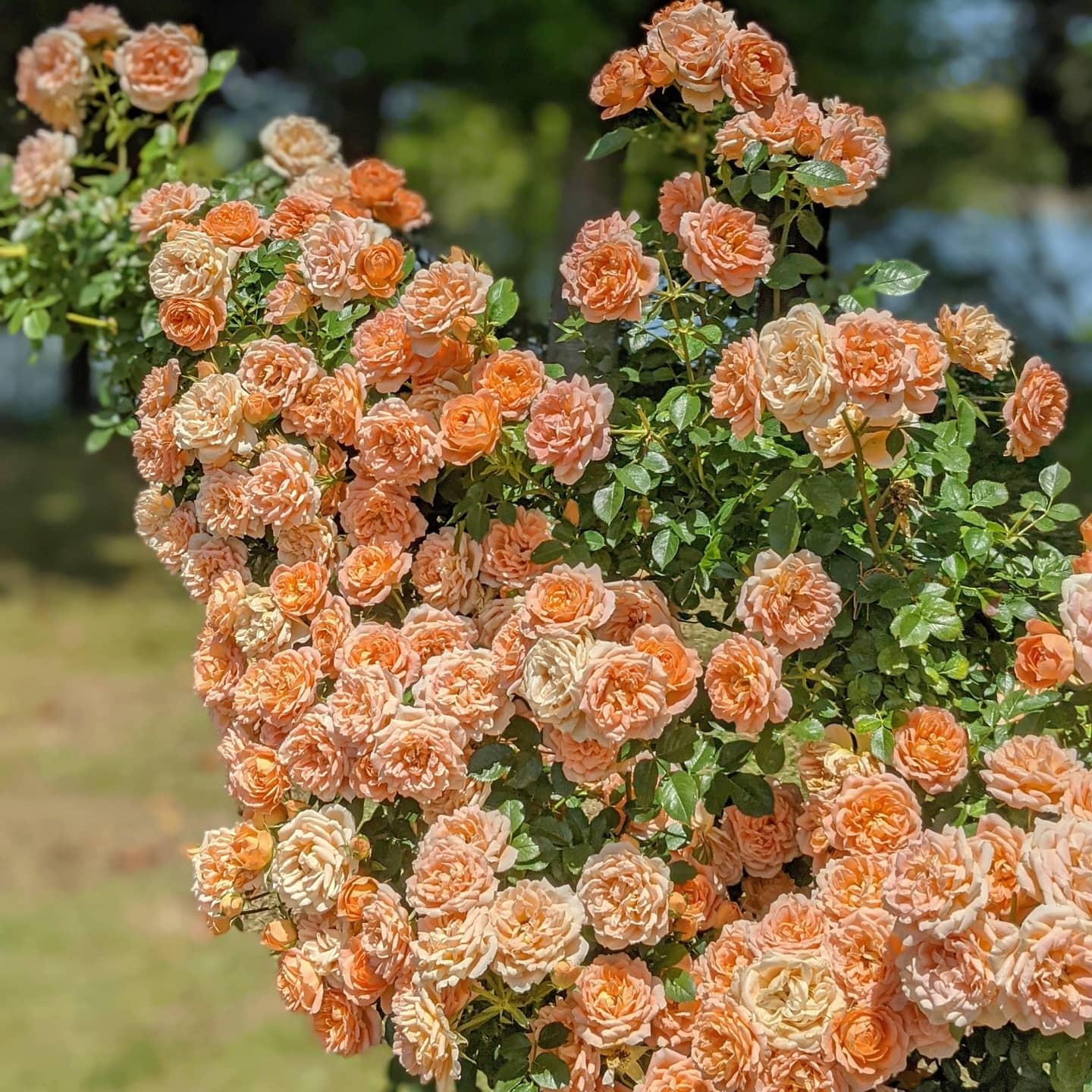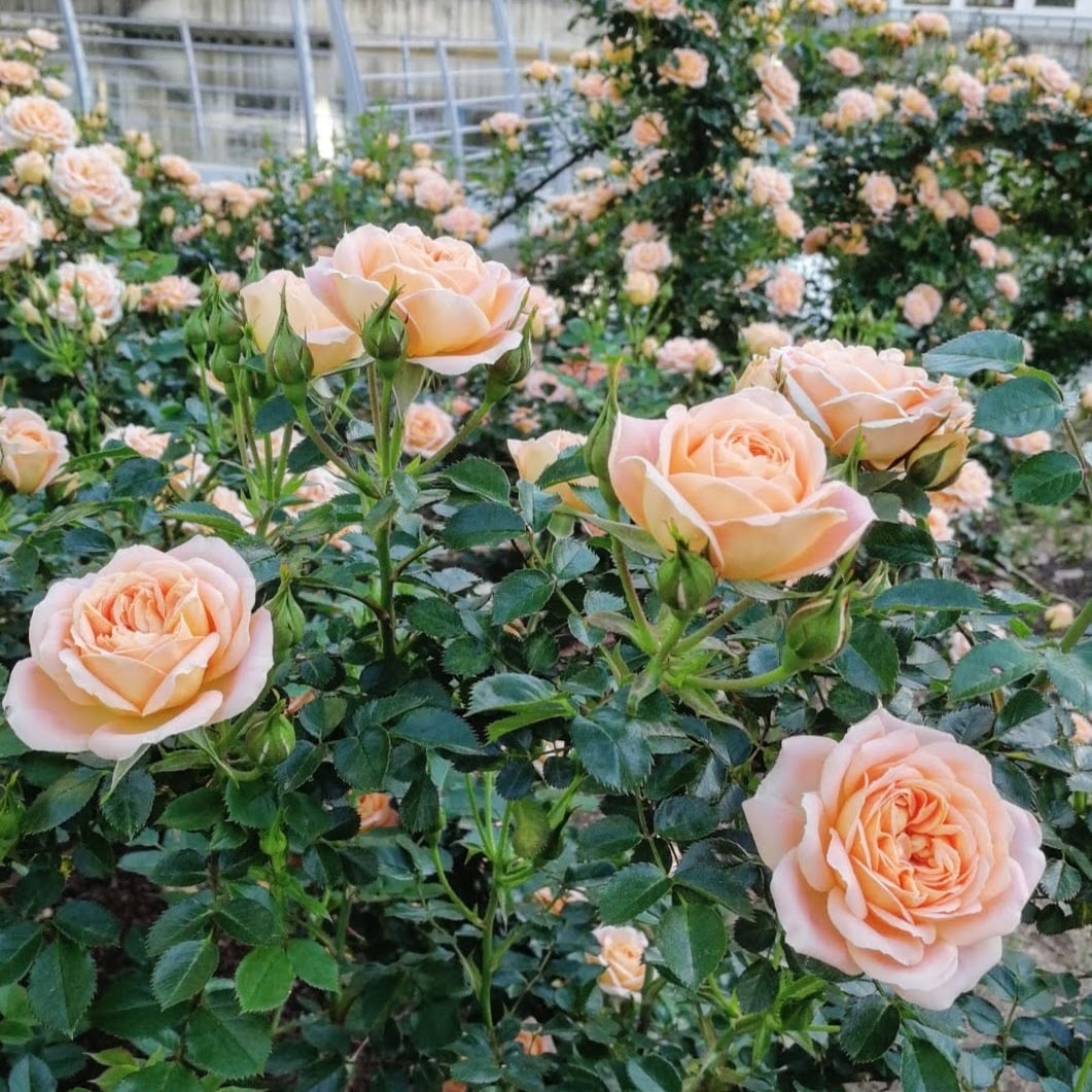 ピーチアプリコットの八重咲き。系統上はフロリバンダ(四季咲き中輪花)だがよく伸びるので小型のつるバラとしても有用。カップ咲きの可愛らしい花形が魅力。