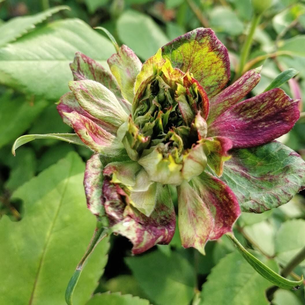 別名:グリーンローズ。ロサ・キネンシスの変種で花びらが葉に変化したもの。グリーン地に赤茶色の斑が入る。,四季咲き性,強健,秋には「紅葉」する。