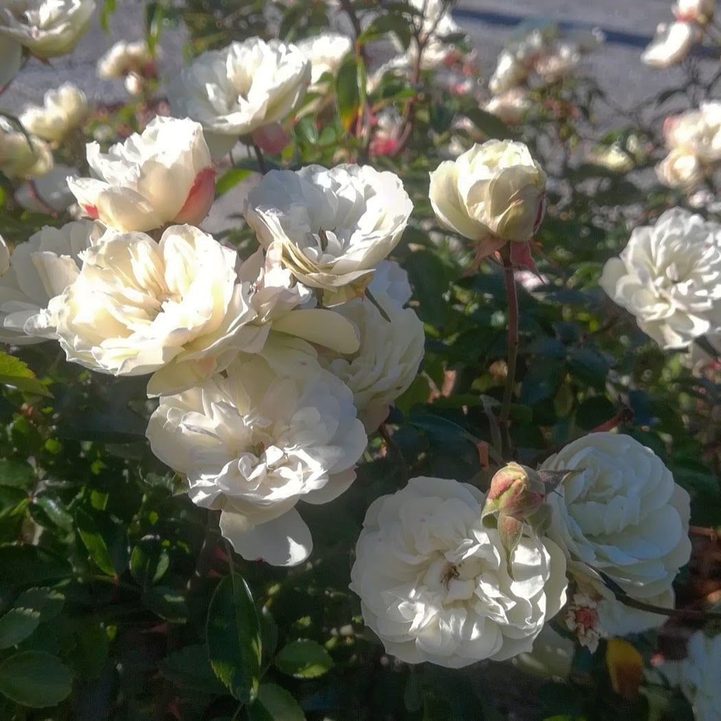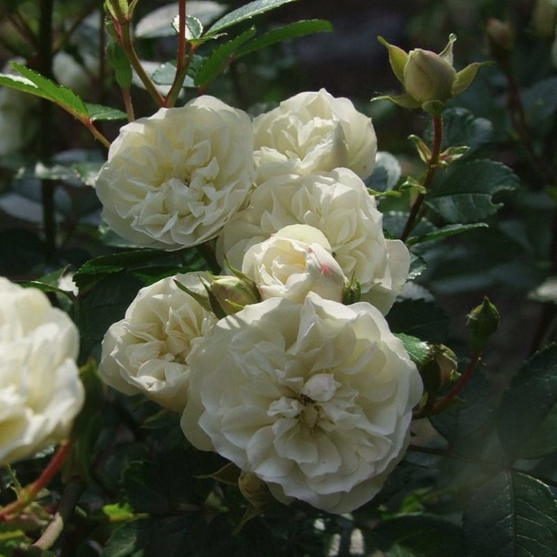 白くて重ねの多く浅いカップ咲き。花持ちがよく緑色に変色。横張りに成長しミニバラとしては比較的大型になる。照り葉も美しい。