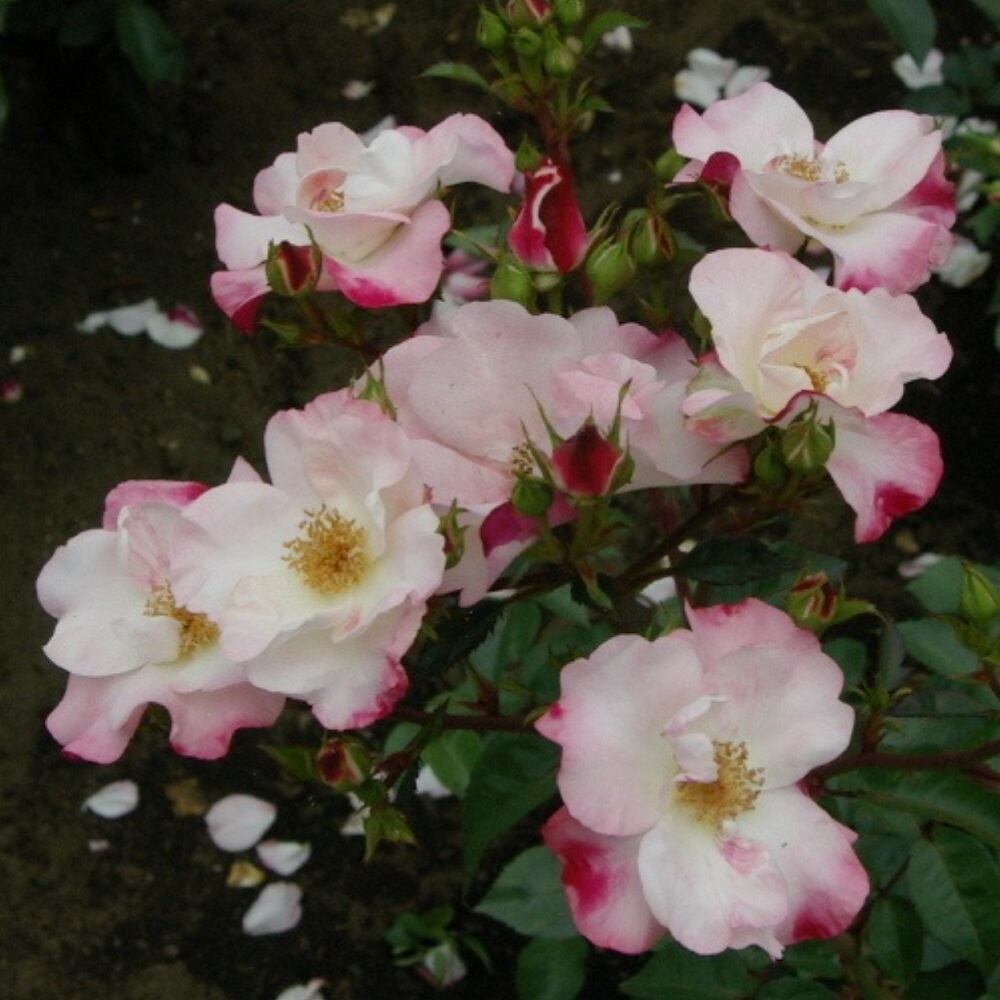 淡いピンクの半八重咲き、咲き進むと弁端より次第に恋ピンクに染まる。花つきが良くよく返り咲く。