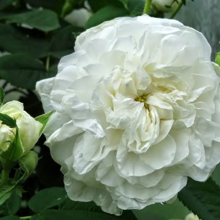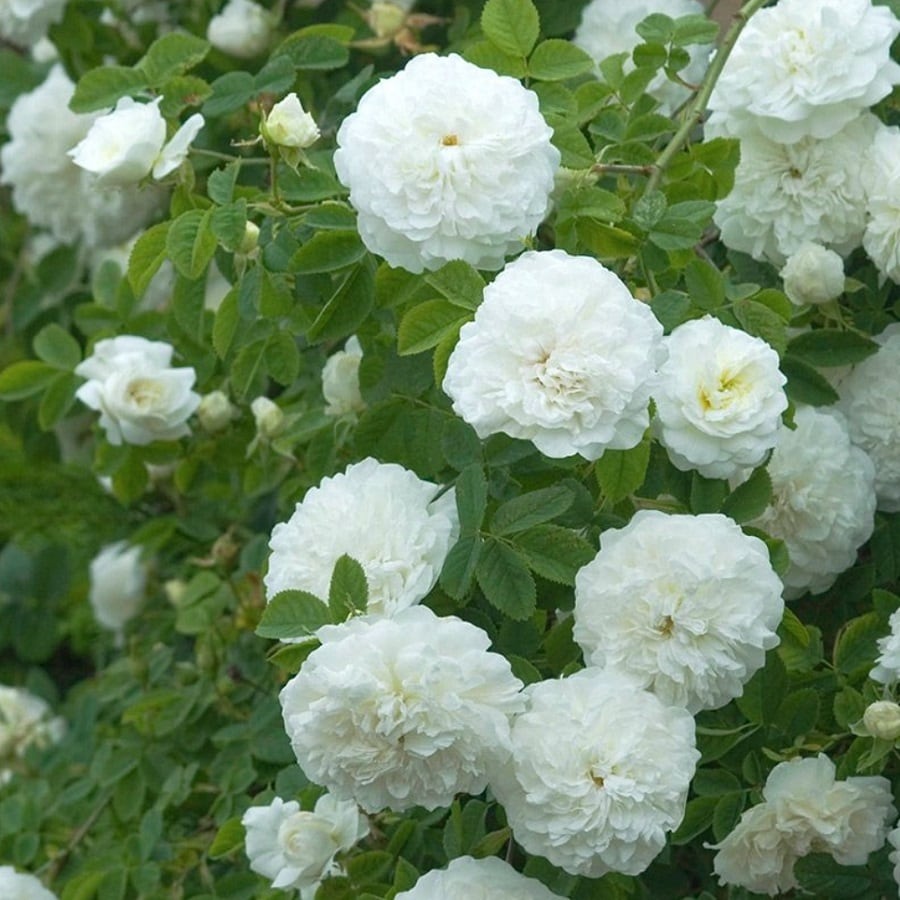 クリーム色から白のポンポン咲き。棘が少ない。少し横張り意味に樹は旺盛に成長する。強い香り。