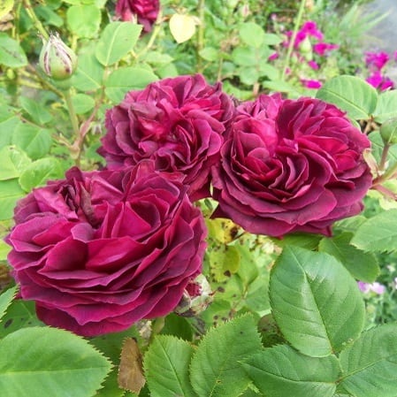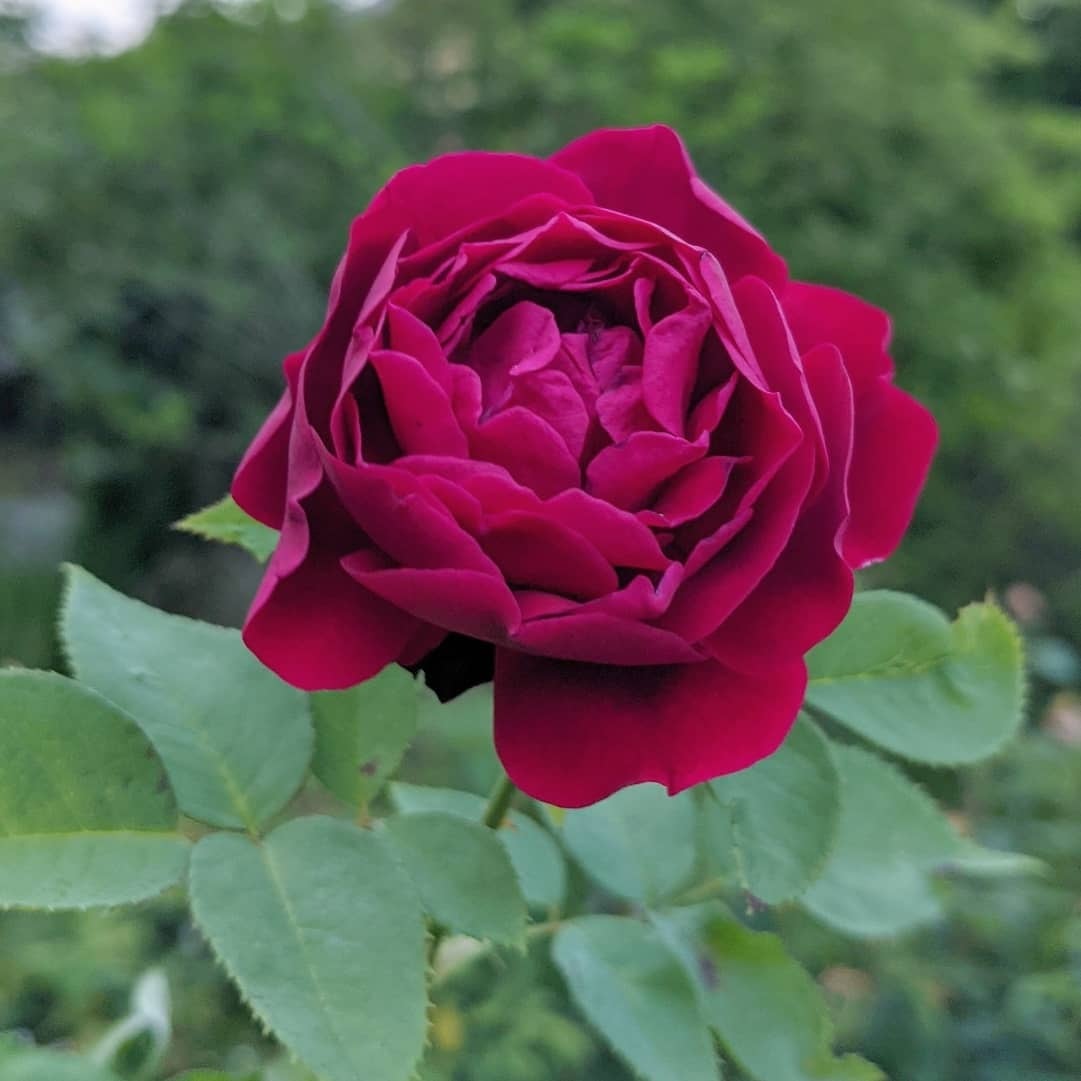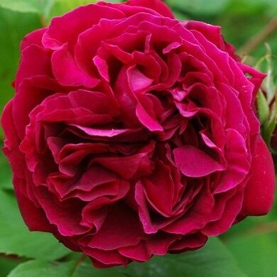 深い紅色の大輪花。とても濃厚な香り。樹は直立気味に成長する。春以降ポツポツと秋まで返り咲く。