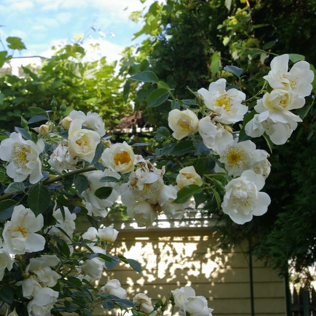半八重、オフホワイトの浅いカップ咲き。強健によく伸びる。半日陰可