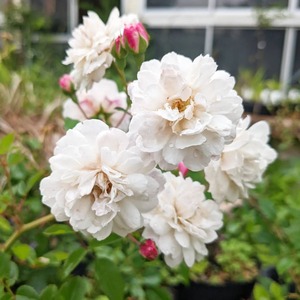 蕾はピンクだが開くと純白の花びら。つる性バラのフェリシテ・ペルぺチュが矮性化し四季咲きするようになったと言われている。