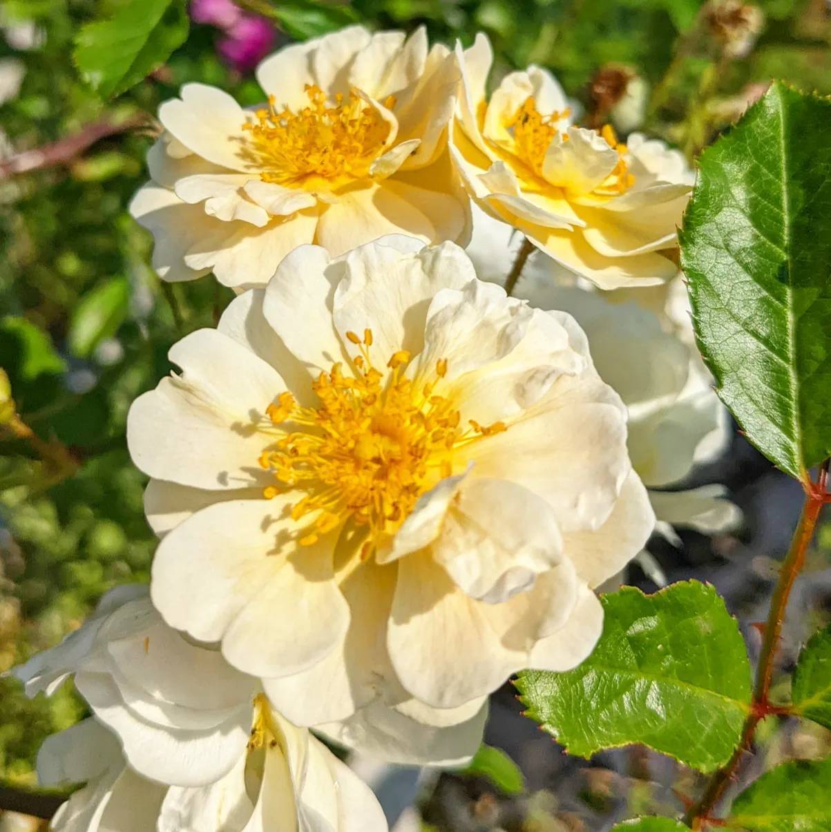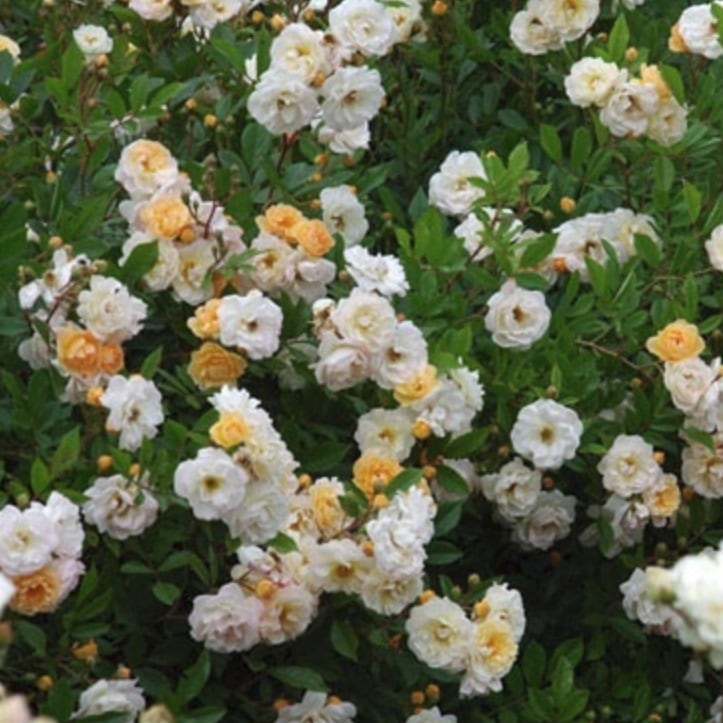 おしべの黄色が美しい。名前は小鳥の「ごしきひわ」の意味。黄色〜白に褪色, トゲは少ない。強健