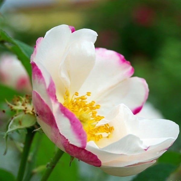 半八重で清楚な雰囲気の花が印象的。クリーム白、花弁の縁にまさに青春の女神が口付けたように赤が乗る。強健
