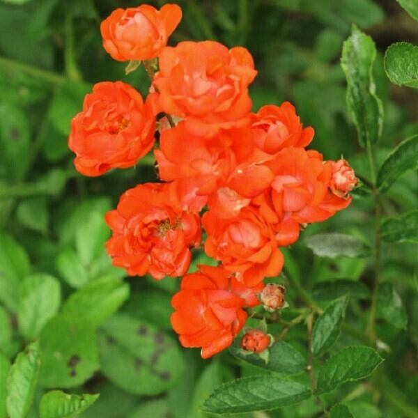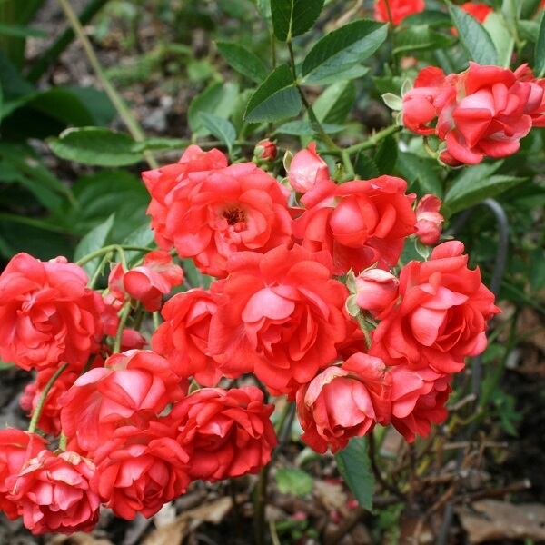 目を引く朱赤の小輪花が房咲きに咲く。インパクトの強い花色だが不思議と淡い色合いとも調和する。差し色がほしい時に。