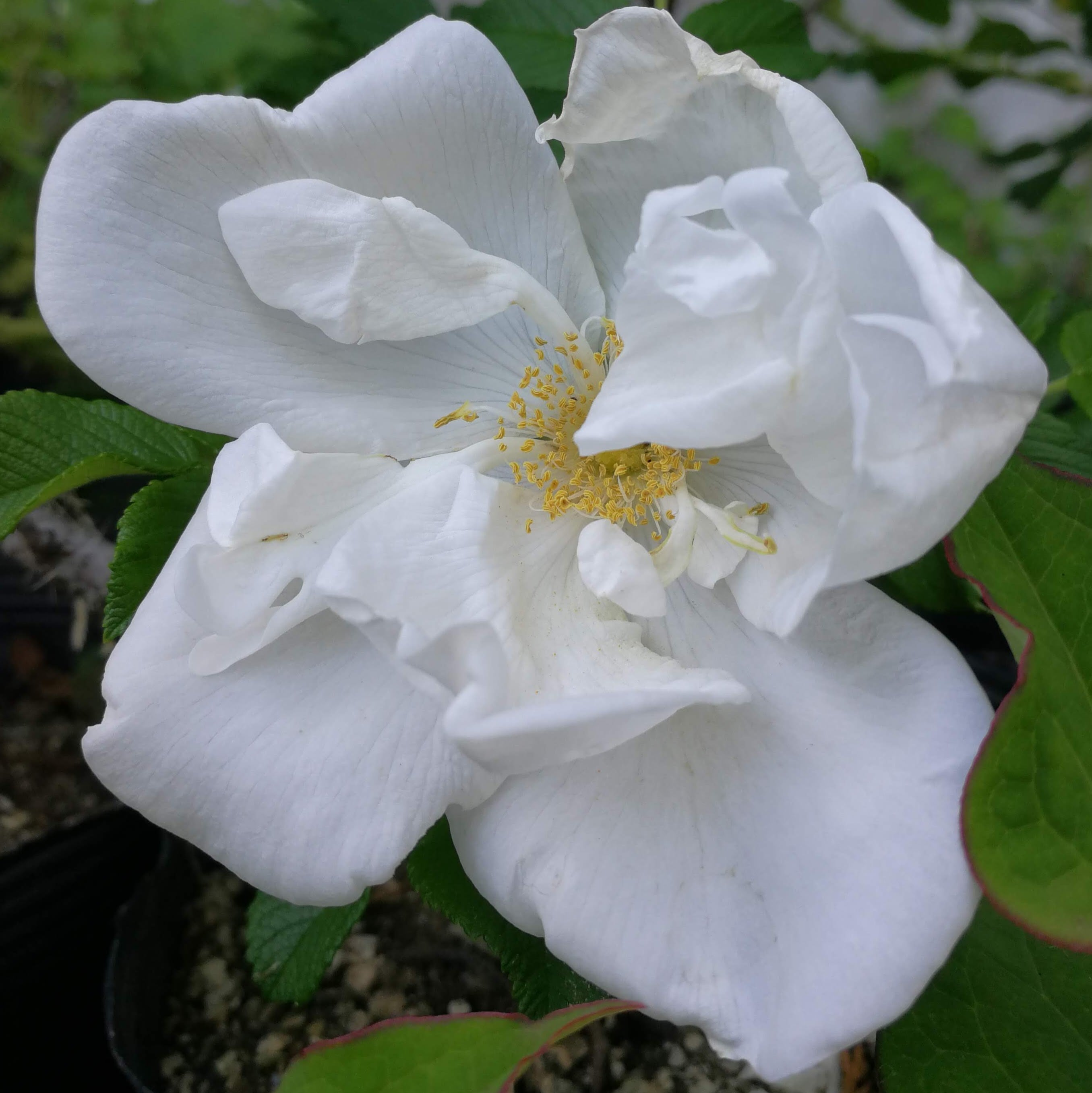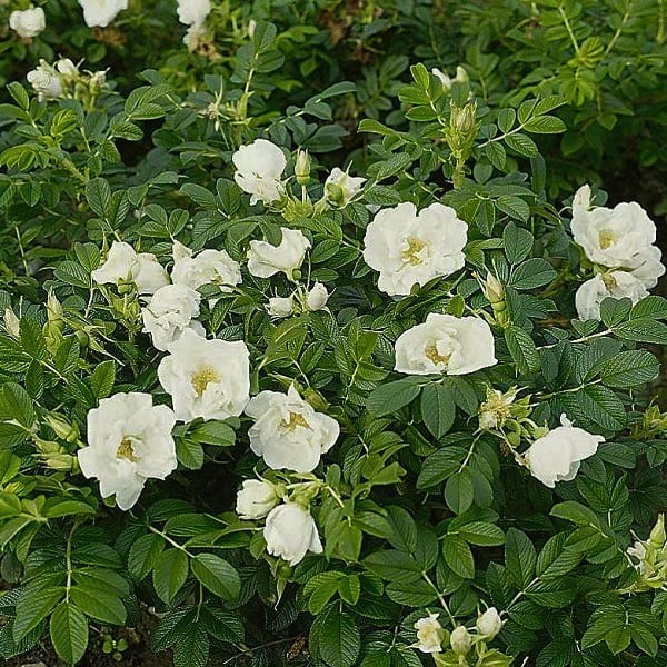 半八重、白のテッシュペーパーを丸めたような繊細な花。香りはハマナス系統独特のスパイシーな強い香りがある。秋には大きな実を楽しむことも出来る。日当たりが必要だがとても強健。