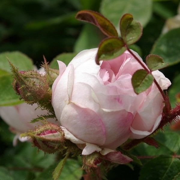 房咲き、開ききると蕊を覗かせる半八重。淡いピンク〜白へと褪色する。モスの中では珍しく春から秋まで咲き続ける。茎のモスは少ない。