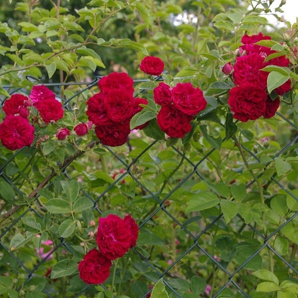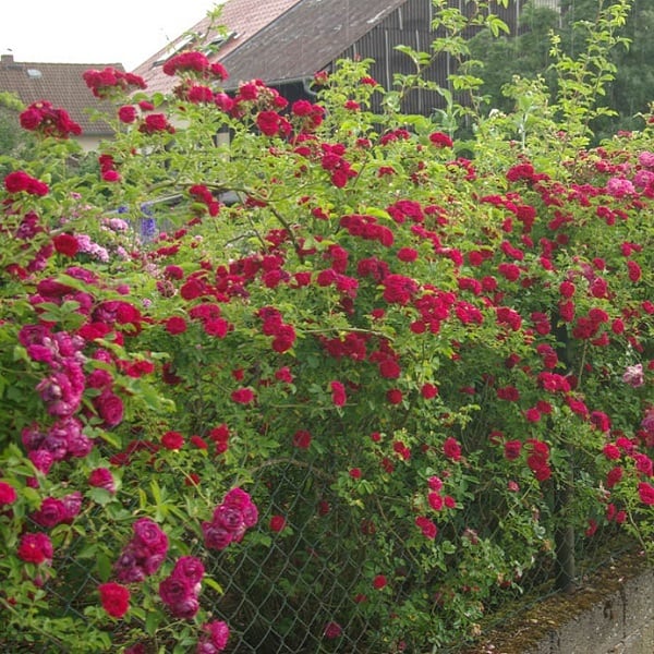 深紅の渋い色味が魅力的なランブラーローズ。細めの枝に溢れんばかりに花をつける。強健で多少のやせ地でも強健に成長する。