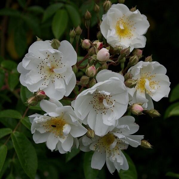半八重の可愛らしい花が房咲きにたくさん咲き秋には実も楽しめる。葉には皺が入り独特の雰囲気。強健で多少の日陰にも耐える。伸ばせば10mほどに伸びる。