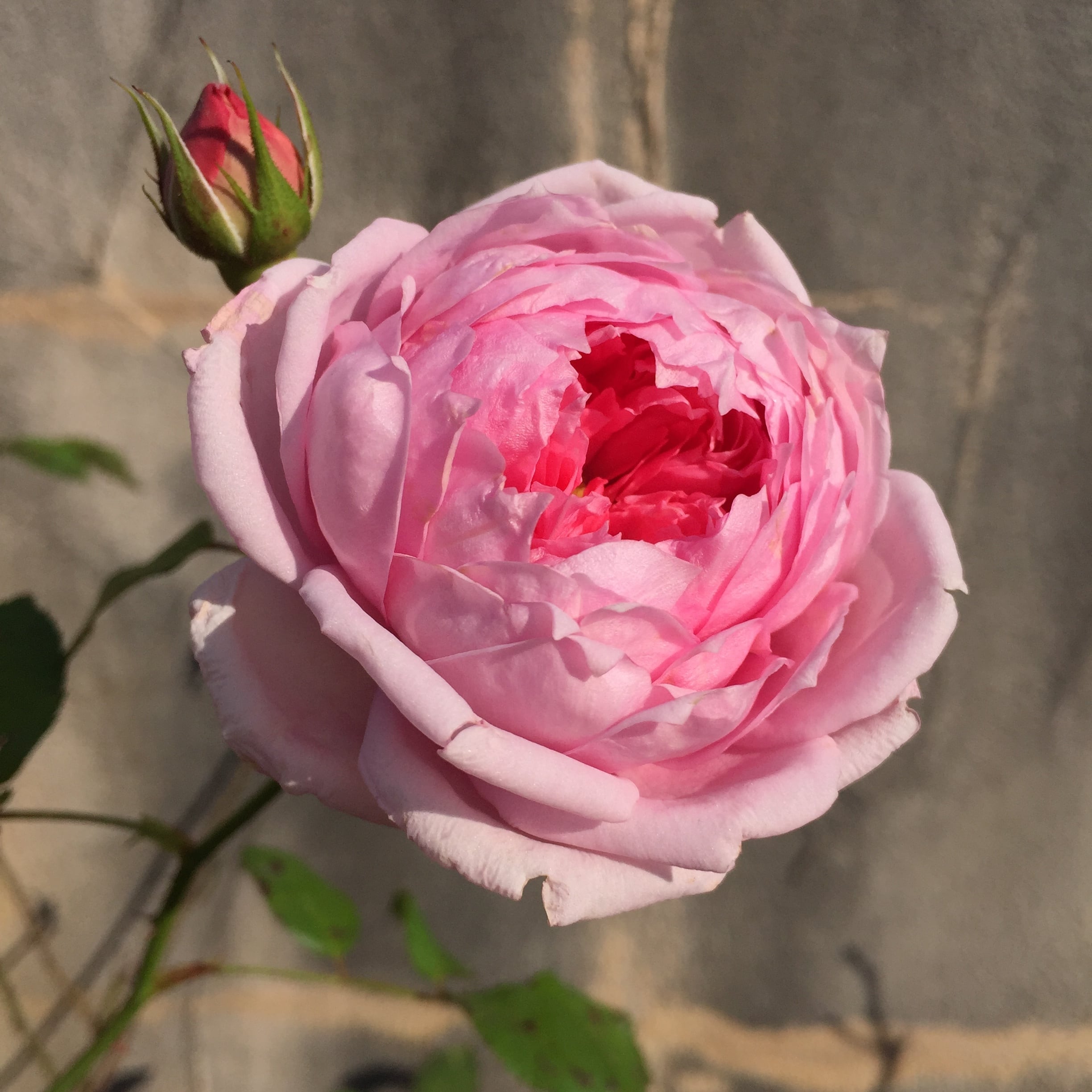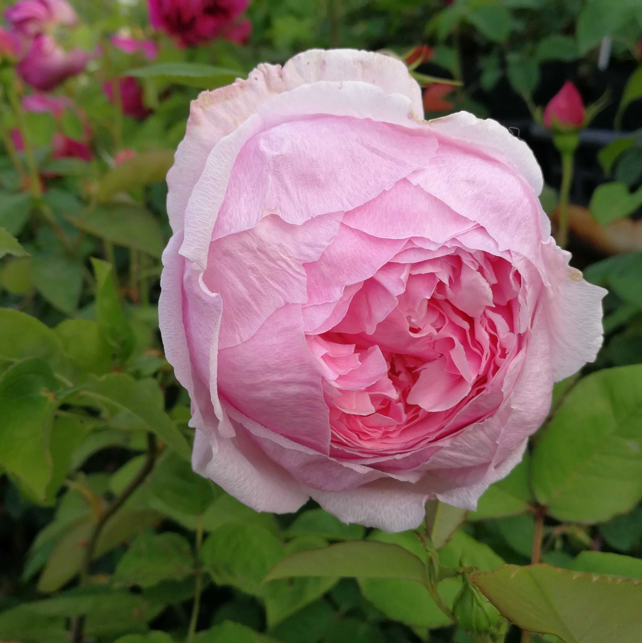 明るいピンク、花びらが中で入り乱れる乱れ咲き。ティーとフルーツのほどよい香り。初期のイングリッシュローズの一つ。