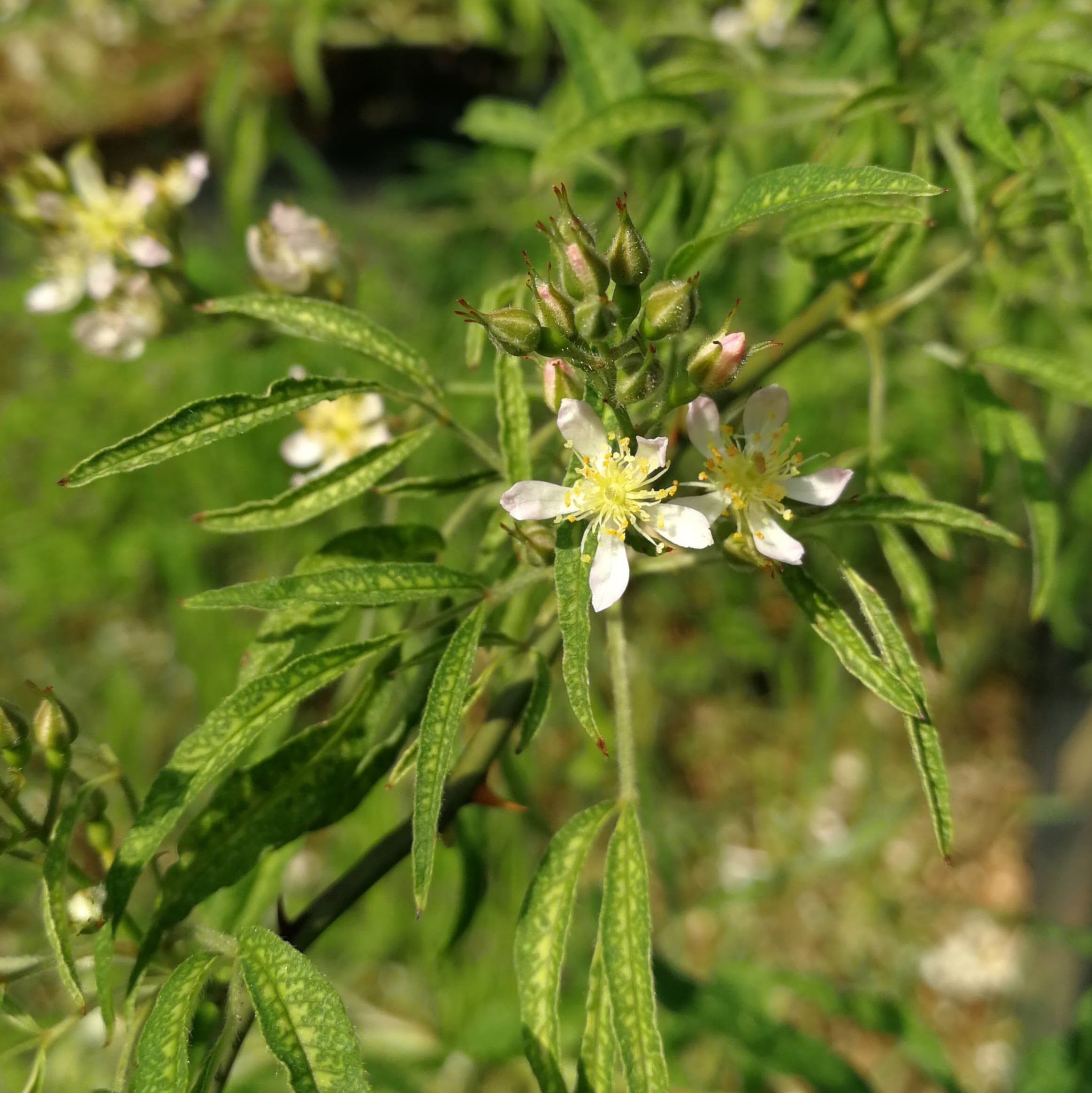 別名:ショウノスケバラ、錦糸茨 柳のようなバラとは思えない葉、1センチほどの極小の花など他のバラとはかなり趣の異なるバラ。樹は強健に2mほどに成長する。