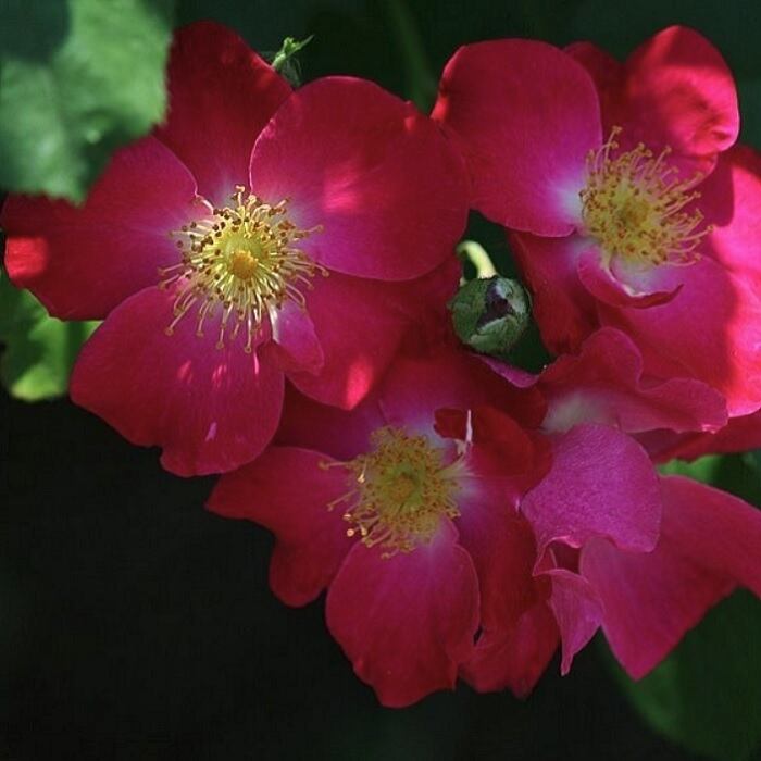 一重の鮮明なローズレッド、花芯の黄色が非常に目を引く。照り葉との対比も美しい。強健で枝が剛直に伸びる。