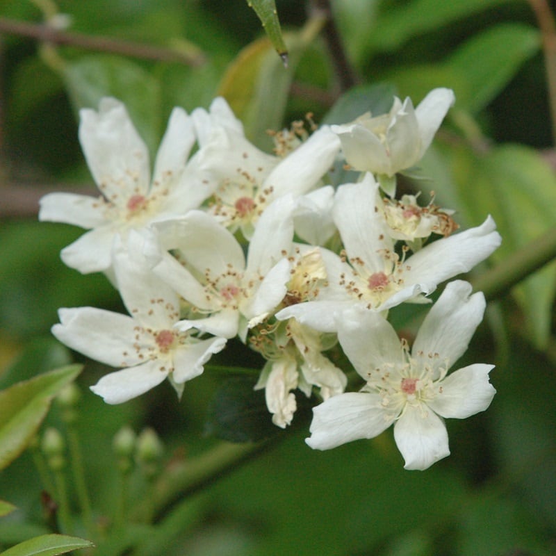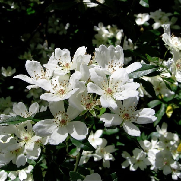 一重の白モッコウバラ。八重のものに比べより香りが強く、すみれのような良い香りが漂う。幹には少し棘がある。強健